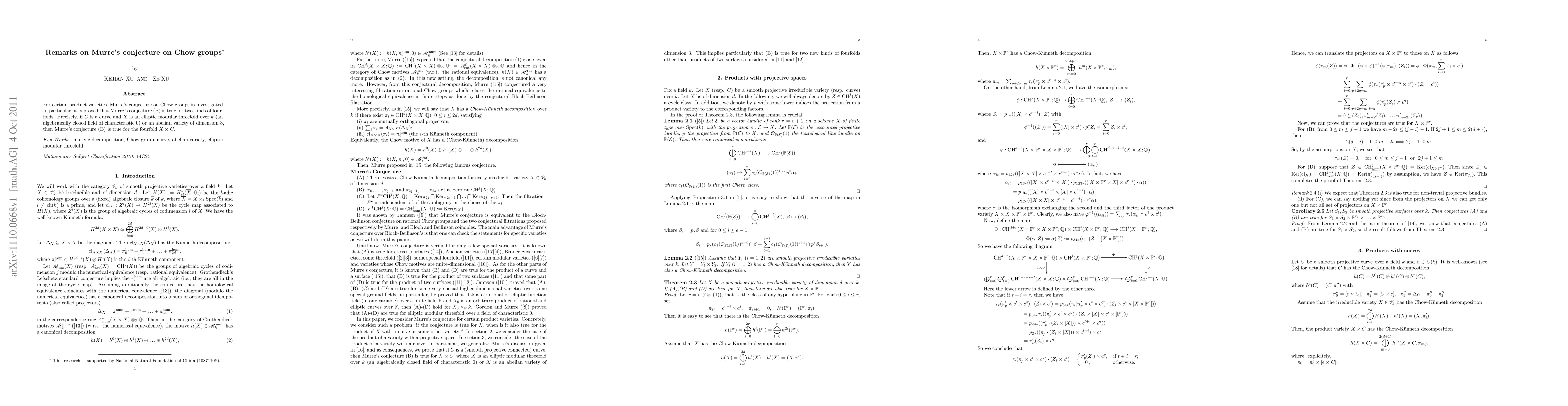 For certain product varieties, Murre's conjecture on Chow groups is investigated. In particular, it is proved that Murre's conjecture (B) is true for two kinds of four-folds. Precisely, if $C$ is a curve and $X$ is an elliptic modular threefold over $k$ (an algebraically closed field of characteristic 0) or an abelian variety of dimension 3, then Murre's conjecture (B) is true for the fourfold $X\times C.$