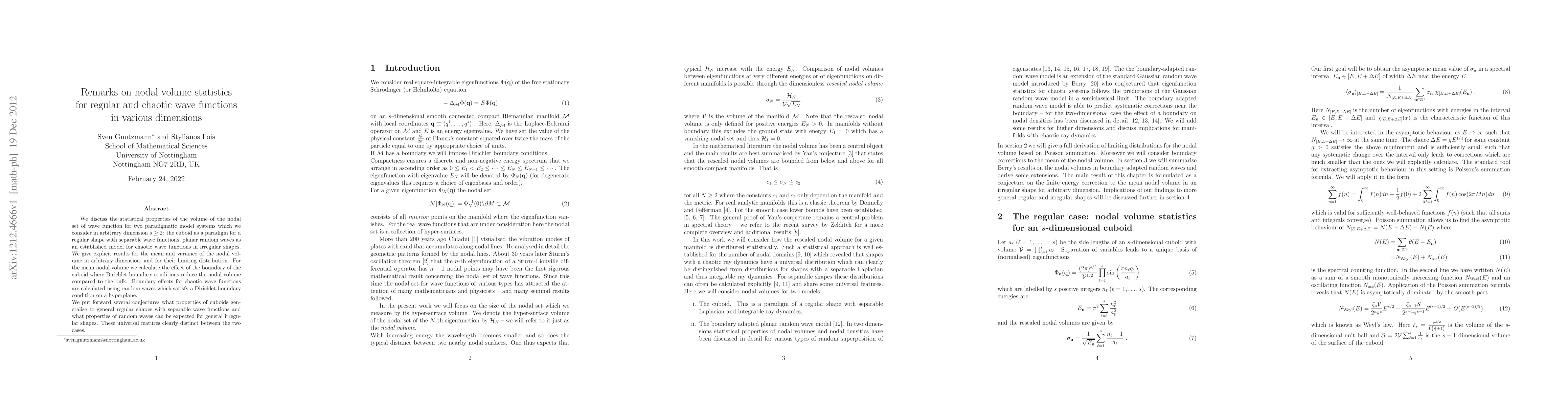 We discuss the statistical properties of the volume of the nodal set of wave function for two paradigmatic model systems which we consider in arbitrary dimension $s\ge 2$: the cuboid as a paradigm for a regular shape with separable wave functions, planar random waves as an established model for chaotic wave functions in irregular shapes. We give explicit results for the mean and variance of the nodal volume in arbitrary dimension, and for their limiting distribution. For the mean nodal volume we calculate the effect of the boundary of the cuboid where Dirichlet boundary conditions reduce the nodal volume compared to the bulk. Boundary effects for chaotic wave functions are calculated using random waves which satisfy a Dirichlet boundary condition on a hyperplane. We put forward several conjectures what properties of cuboids generalise to general regular shapes with separable wave functions and what properties of random waves can be expected for general irregular shapes. These universal features clearly distinct between the two cases.