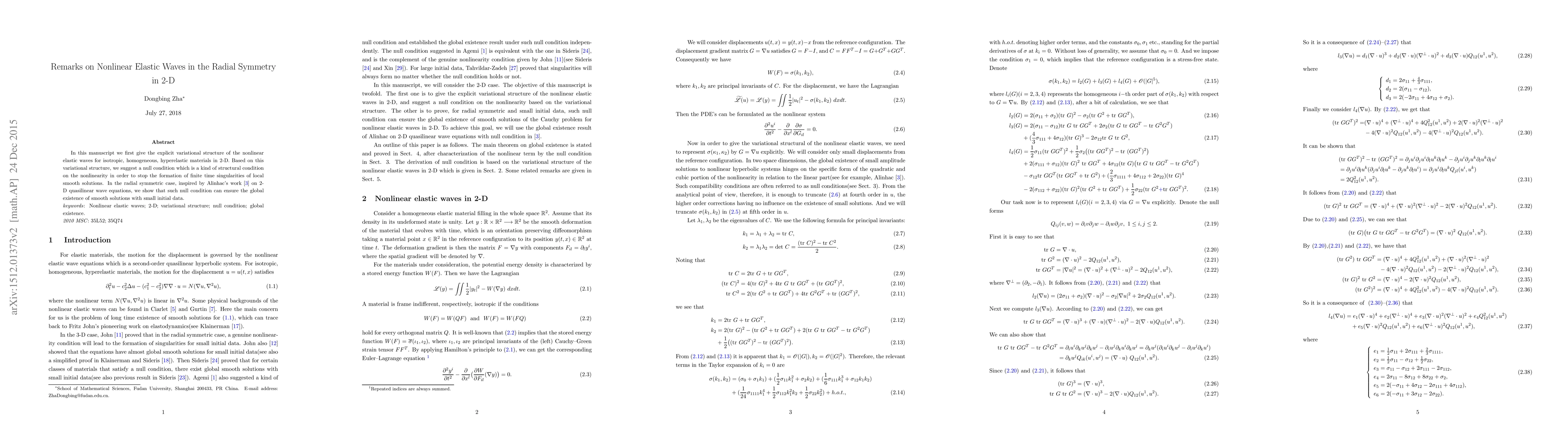 In this manuscript we first give the explicit variational structure of the nonlinear elastic waves for isotropic, homogeneous, hyperelastic materials in 2-D. Based on this variational structure, we suggest a null condition which is a kind of structural condition on the nonlinearity in order to stop the formation of finite time singularities of local smooth solutions. In the radial symmetric case, inspired by Alinhac's work [3] on 2-D quasilinear wave equations, we show that such null condition can ensure the globalexistence of smooth solutions with small initial data.