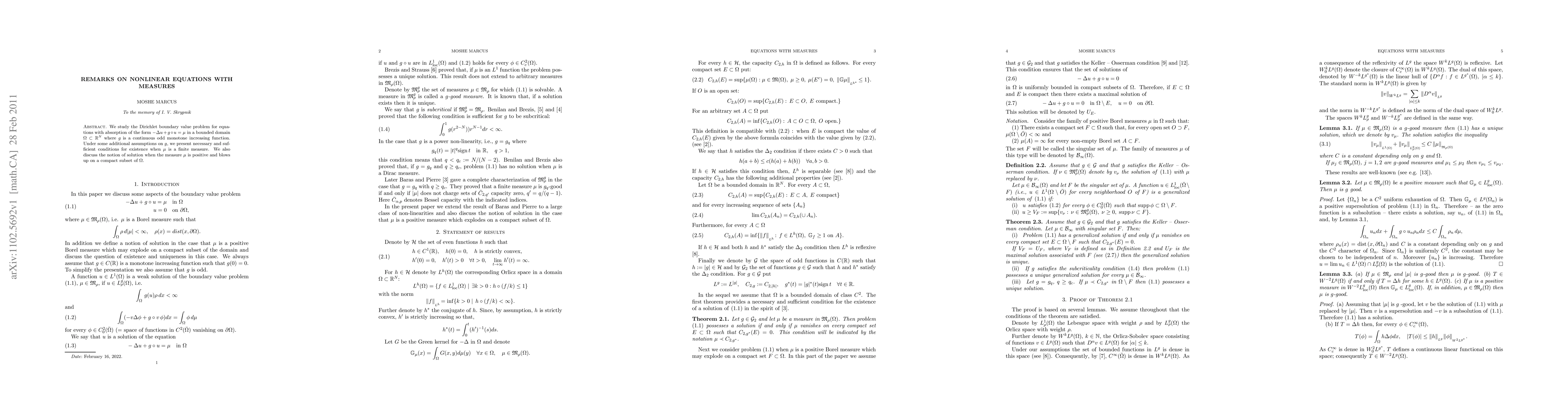 We study the Dirichlet boundary value problem for equations with absorption of the form $-\Delta u+g\circ u=\mu$ in a bounded domain $\Omega\subset R^N$ where $g$ is a continuous odd monotone increasing function. Under some additional assumptions on $g$, we present necessary and sufficient conditions for existence when $\mu$ is a finite measure. We also discuss the notion of solution when the measure $\mu$ is positive and blows up on a compact subset of $\Gw$.