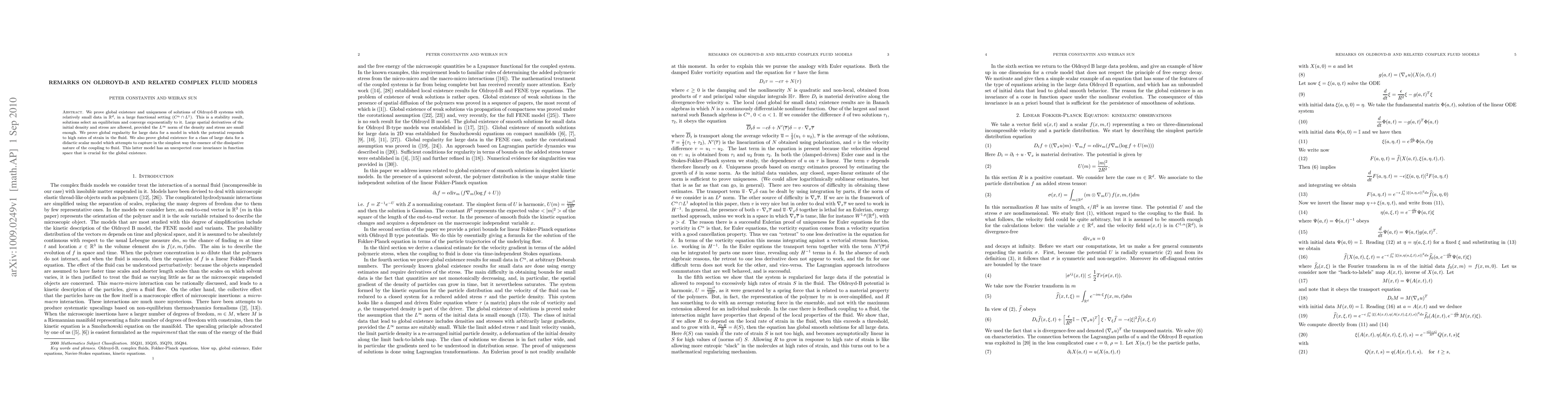 We prove global existence and uniqueness of solutions of Oldroyd-B systems with relatively small data in $\Rr^d$, in a large functional setting ($C^{\alpha}\cap L^1$). This is a stability result, solutions select an equilibrium and converge exponentially to it. Large spatial derivatives of the initial density and stress are allowed, provided the $L^{\infty}$ norm of the density and stress are small enough. We prove global regularity for large data for a model in which the potential responds to high rates of strain in the fluid. We also prove global existence for a class of large data for a didactic scalar model which attempts to capture in the simplest way the essence of the dissipative nature of the coupling to fluid. This latter model has an unexpected cone invariance in function space that is crucial for the global existence.