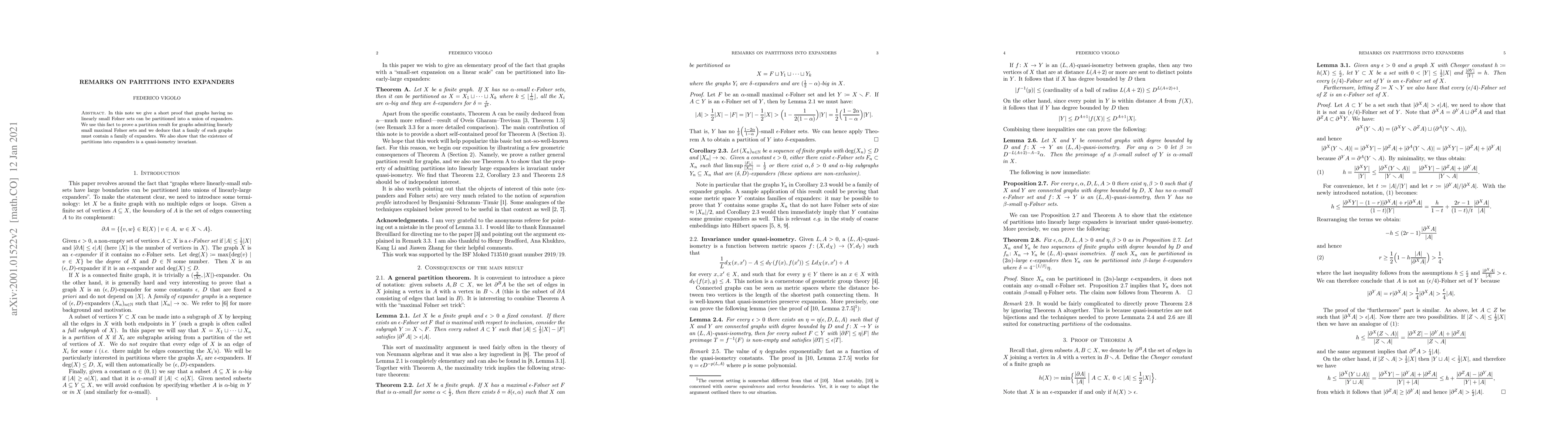 In this note we give a short proof that graphs having no linearly small F{\o}lner sets can be partitioned into a union of expanders. We use this fact to prove a partition result for graphs admitting linearly small maximal F{\o}lner sets and we deduce that a family of such graphs must contain a family of expanders. We also show that the existence of partitions into expanders is a quasi-isometry invariant.
