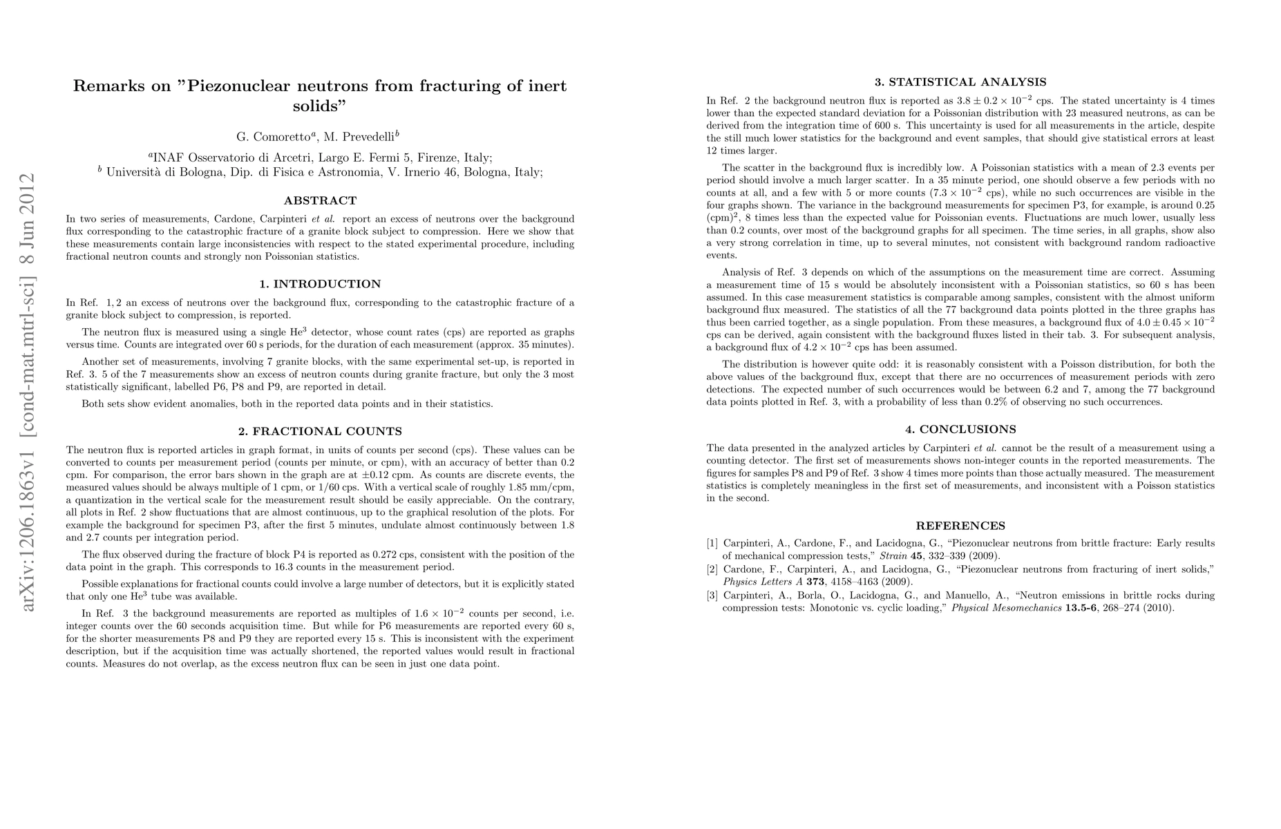In two series of measurements, Cardone, Carpinteri et al. report an excess of neutrons over the background flux corresponding to the catastrophic fracture of a granite block subject to compression. Here we show that these measurements contain large inconsistencies with respect to the stated experimental procedure, including fractional neutron counts and strongly non Poissonian statistics