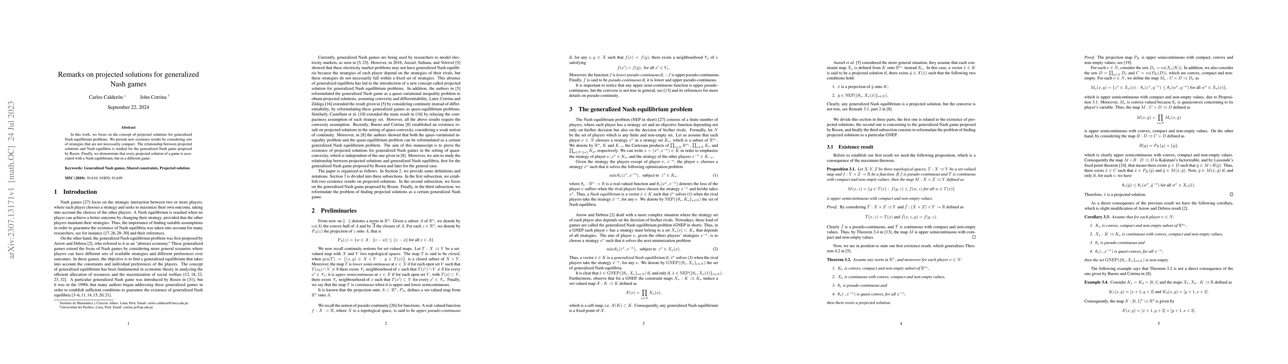 This paper explores projected solutions for generalized Nash equilibrium problems, presenting new existence results for non-compact strategy sets. It establishes a relationship between projected solutions and Nash equilibria in Rosen's generalized Nash game, showing that each projected solution corresponds to a Nash equilibrium in a different game.