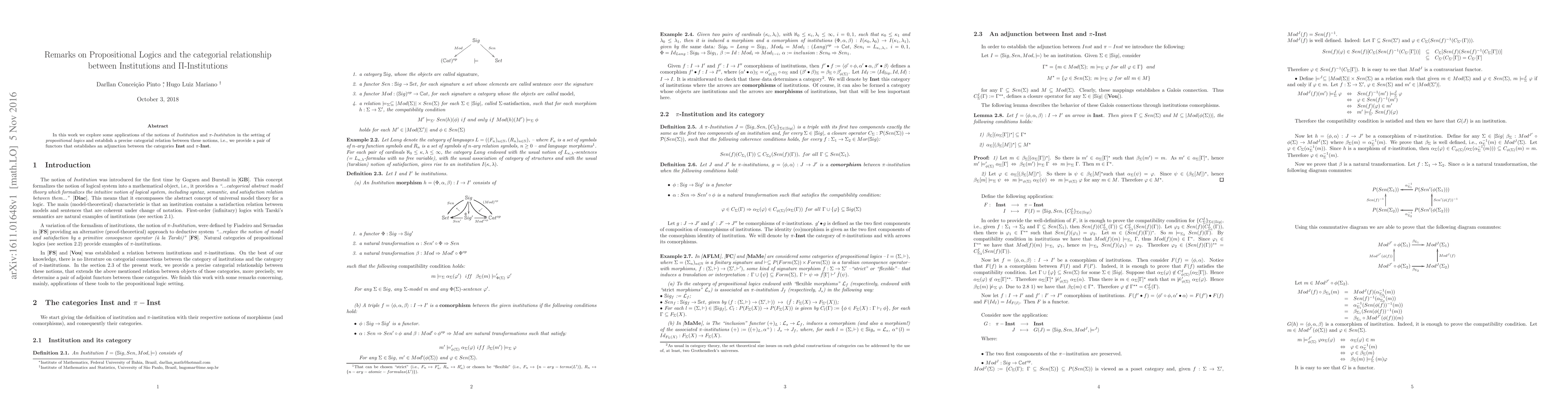 In this work we explore some applications of the notions of Institution and {\Pi}-Institution in the setting of propositional logics and establish a precise categorial relation between these notions, i.e., we provide a pair of functors that establishes an adjunction between the categories Inst and {\Pi}-Inst.