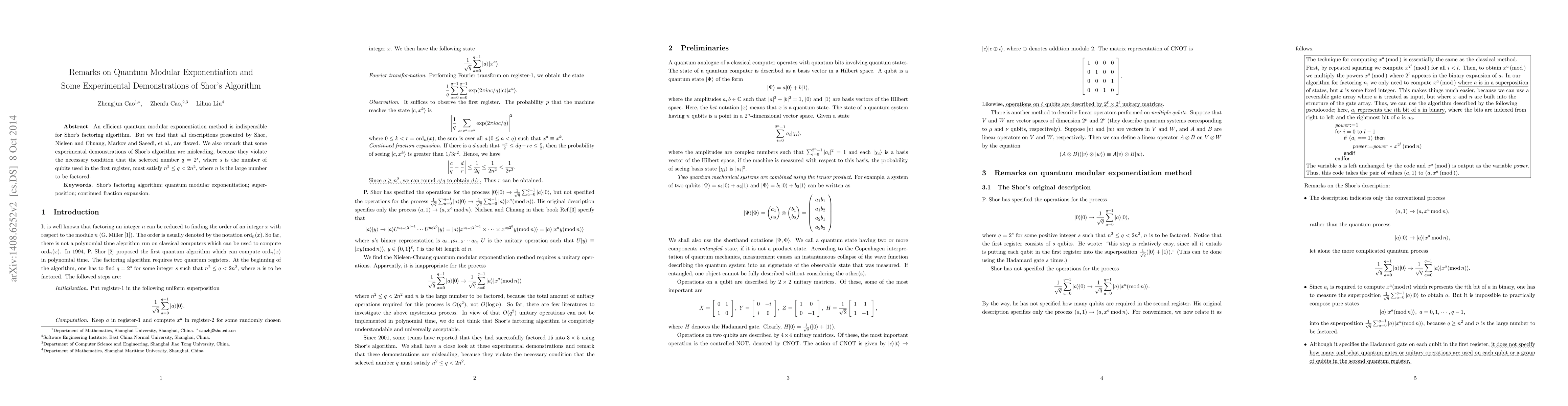 This paper critiques existing descriptions of quantum modular exponentiation, identifying flaws in the explanations by Shor, Nielsen and Chuang, Markov, and Saeedi et al. It also highlights that some experimental demonstrations of Shor's algorithm are misleading due to violations of the necessary condition for the number of qubits in the first register.