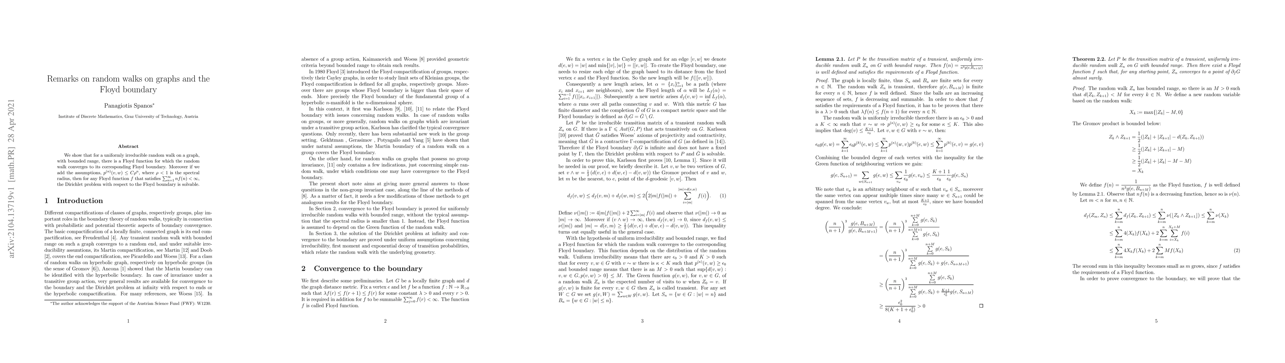 Summary: This paper demonstrates that a uniformly irreducible random walk on a graph with bounded range converges to a Floyd boundary using a specific Floyd function. Under additional assumptions on the spectral radius, it proves the solvability of the Dirichlet problem concerning the Floyd boundary.