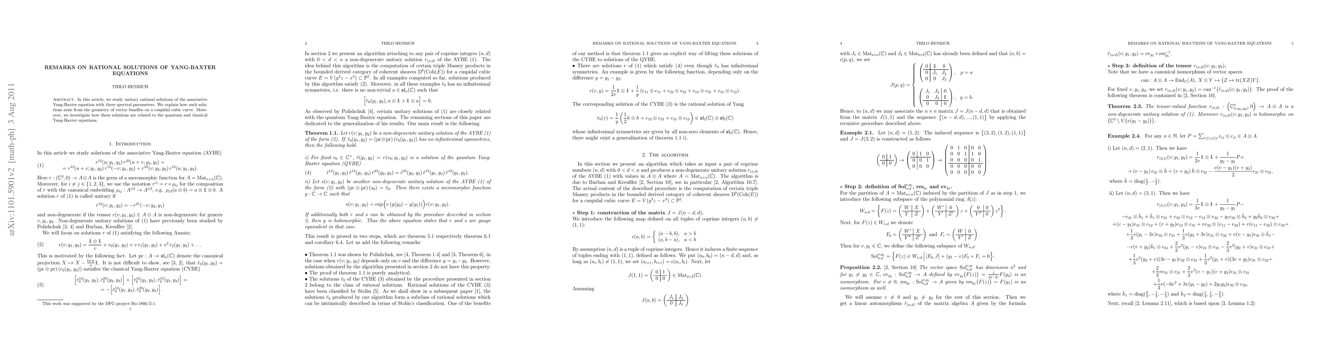 In this article, we study unitary rational solutions of the associative Yang-Baxter equation with three spectral parameters. We explain how such solutions arise from the geometry of vector bundles on a cuspidal cubic curve. Moreover, we investigate how these solutions are related to the quantum and classical Yang-Baxter equations.
