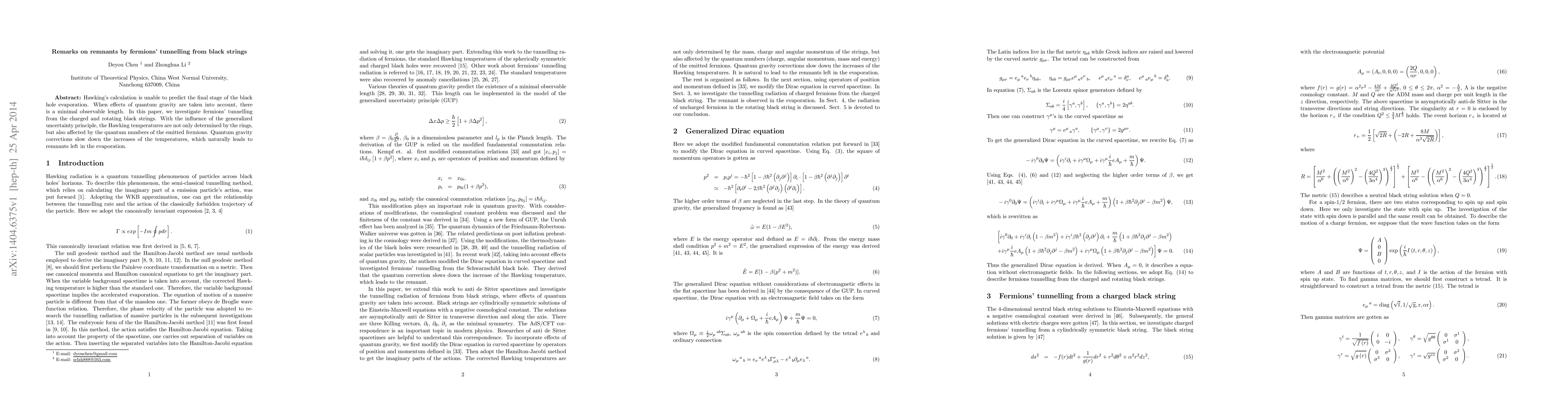 This paper explores fermions' tunnelling from charged and rotating black strings, revealing that quantum gravity corrections, including the generalized uncertainty principle, affect Hawking temperatures and lead to remnants in the black hole evaporation process. These corrections slow down temperature increases, resulting in leftover remnants.