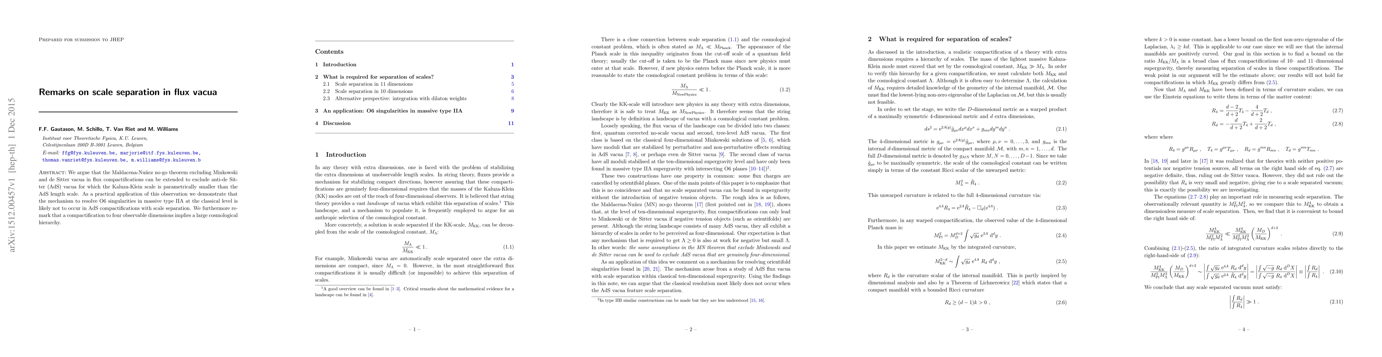 Summary: The paper extends the Maldacena-Nunez theorem to exclude anti-de Sitter (AdS) vacua in flux compactifications with a small Kaluza-Klein scale, indicating that resolving O6 singularities in massive type IIA likely fails in such AdS compactifications. It also notes that a compactification leading to four observable dimensions necessitates a large cosmological hierarchy.