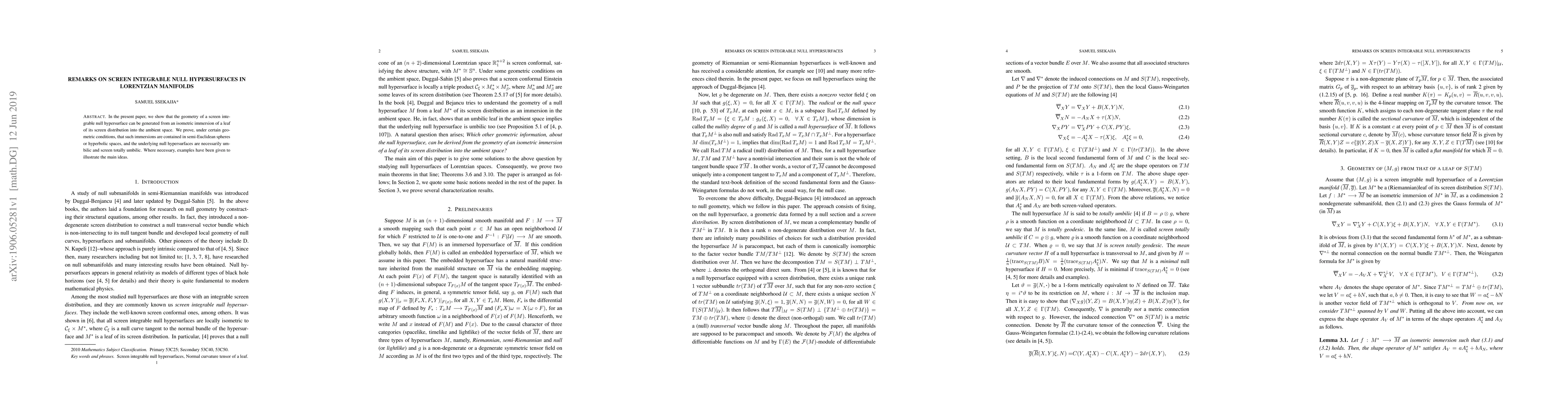 In the present paper, we show that the geometry of a screen integrable null hypersurface can be generated from an isometric immersion of a leaf of its screen distribution into the ambient space. We prove, under certain geometric conditions, that such immersions are contained in semi-Euclidean spheres or hyperbolic spaces, and the underlying null hypersurfaces are necessarily umbilic and screen totally umbilic. Where necessary, examples have been given to illustrate the main ideas.