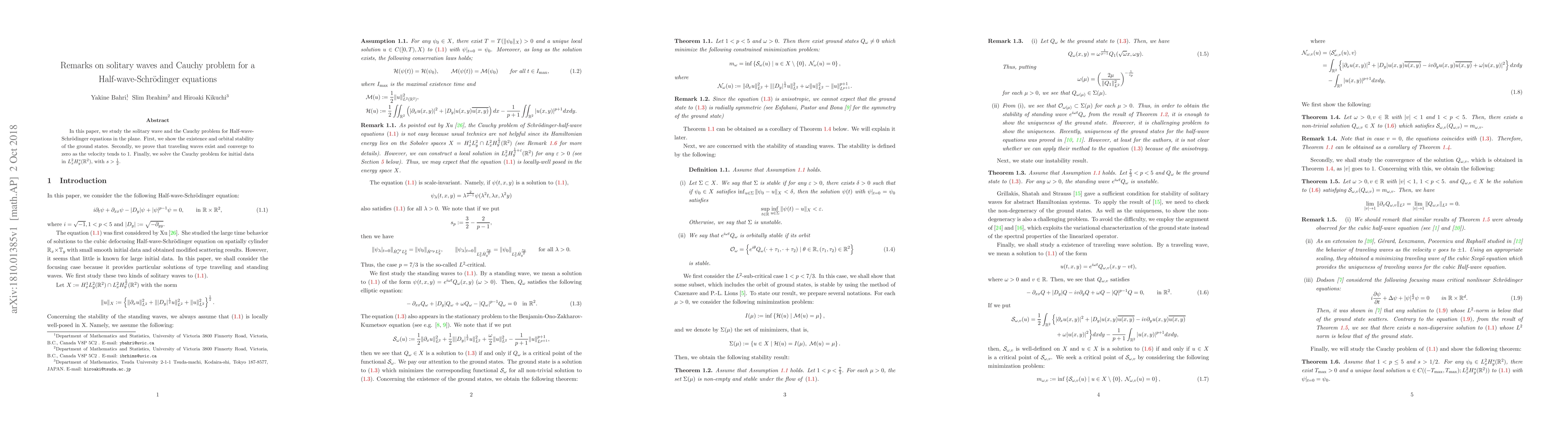 This paper studies the behavior of solitary waves in a specific type of wave equation known as Half-wave-Schr"{o}dinger equations, showing their existence and stability, and solving for initial data that meet certain conditions.