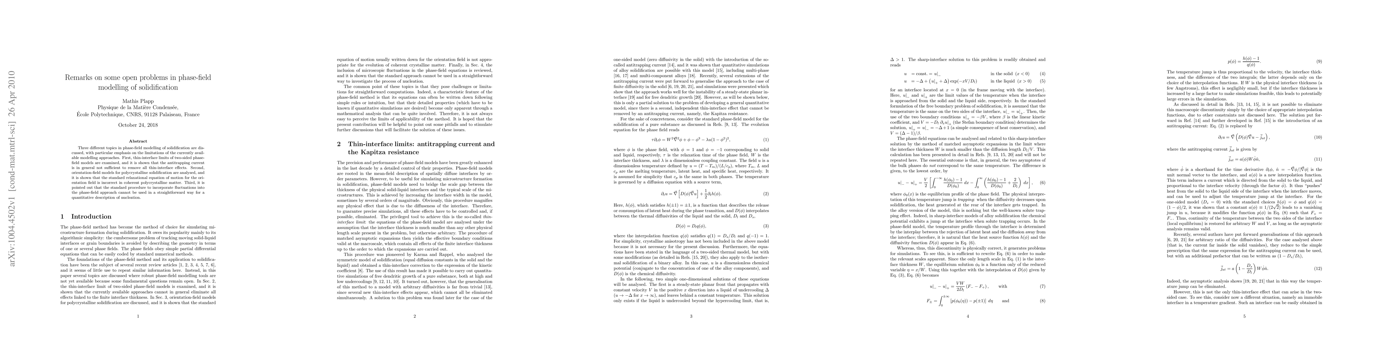 This paper discusses limitations in phase-field modelling of solidification, highlighting issues with thin-interface limits, orientation-field models for polycrystalline solidification, and the incorporation of fluctuations for nucleation description. It reveals that current approaches are insufficient in these areas.