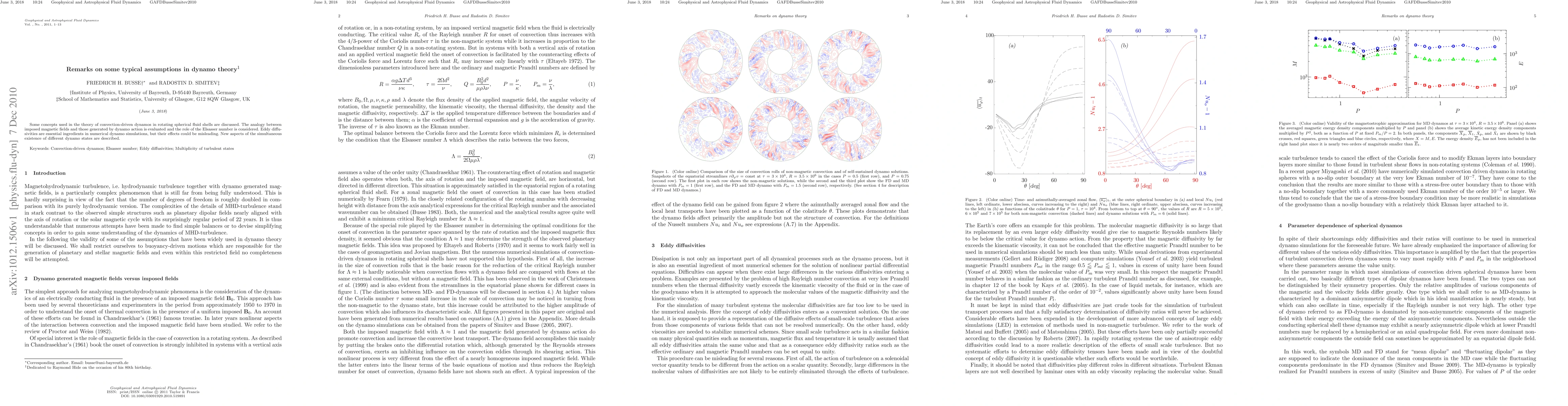 Some concepts used in the theory of convection-driven dynamos in rotating spherical fluid shells are discussed. The analogy between imposed magnetic fields and those generated by dynamo action is evaluated and the role of the Elsasser number is considered. Eddy diffusivities are essential ingredients in numerical dynamo simulations, but their effects could be misleading. New aspects of the simultaneous existence of different dynamo states are described.