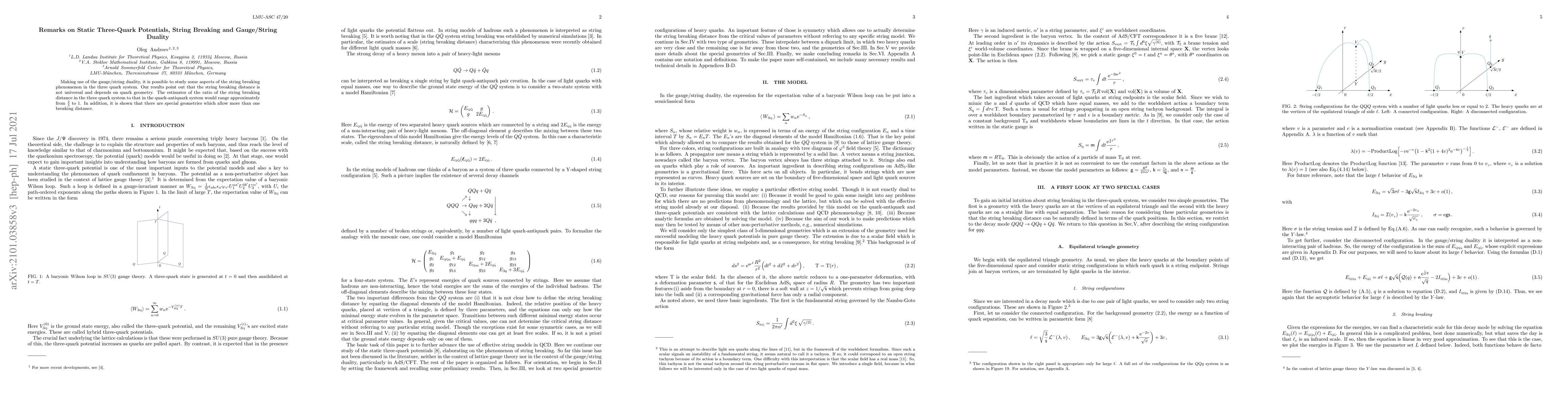 Summary: This study utilizes gauge/string duality to investigate string breaking in three-quark systems, revealing that the breaking distance varies with quark geometry and is not universally fixed. The ratio of the three-quark system's breaking distance to that of a quark-antiquark system ranges from $\frac{2}{3}$ to $1$, with certain geometries permitting multiple breaking distances.