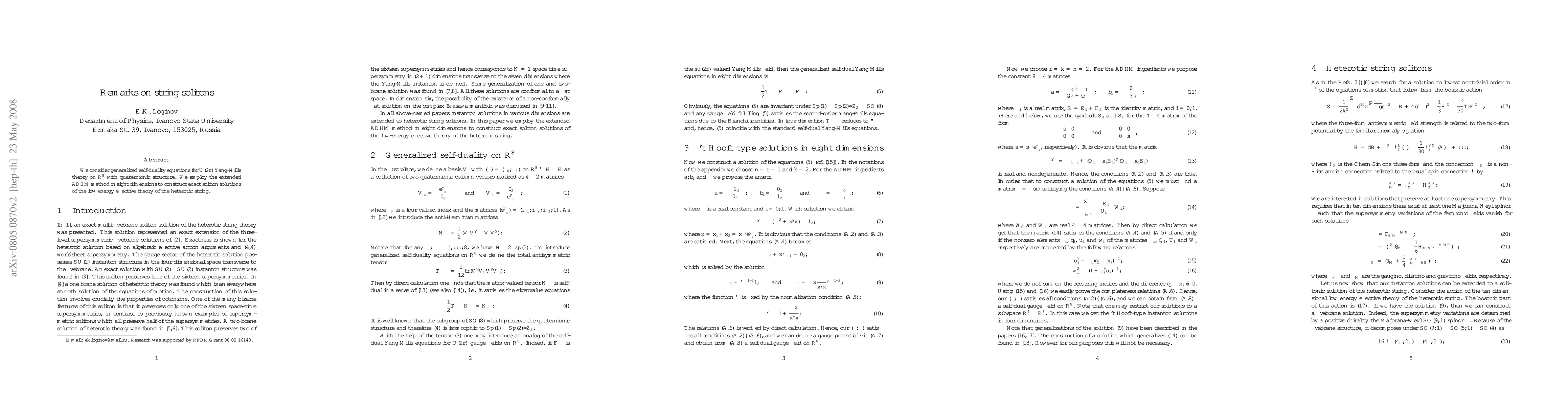 We consider generalized self-duality equations for U(2r) Yang-Mills theory on R^8 with quaternionic structure. We employ the extended ADHM method in eight dimensions to construct exact soliton solutions of the low-energy effective theory of the heterotic string.