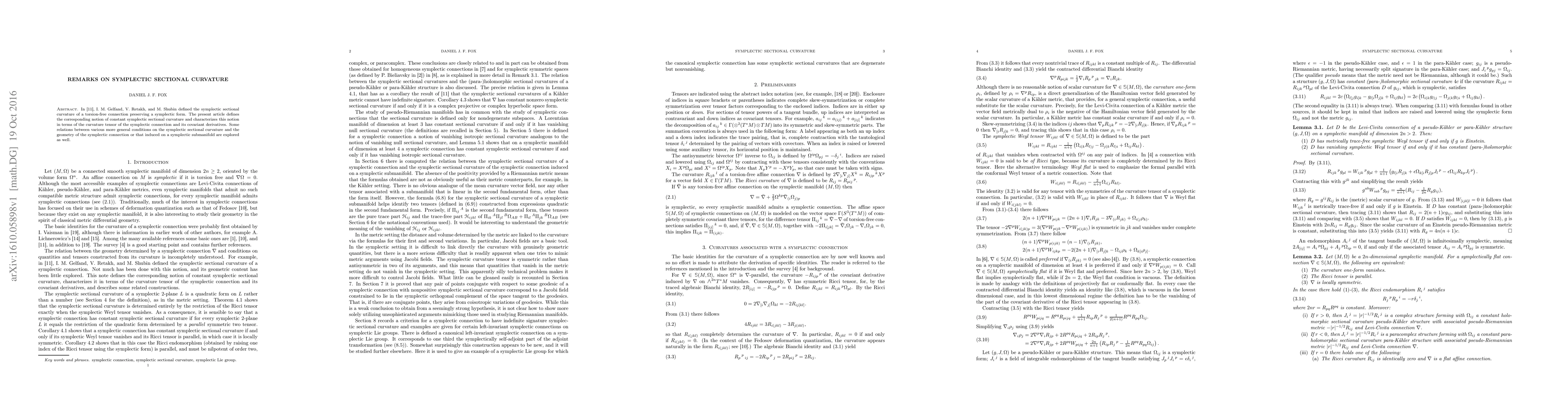 This paper defines constant symplectic sectional curvature for torsion-free connections preserving a symplectic form, characterizing it via the curvature tensor and its derivatives. It also explores relationships between this curvature and the geometry of the symplectic connection and induced submanifolds.