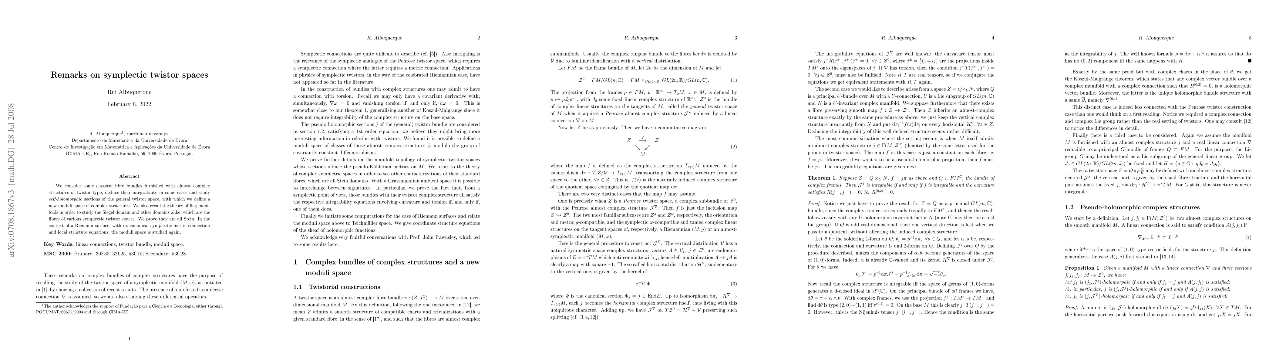 This paper explores classical fibre bundles with twistor-type almost complex structures, focusing on their integrability and self-holomorphic sections within symplectic twistor spaces. It defines a moduli space of compatible complex structures and uses flag manifolds to study related domains, ultimately deriving structure equations for twistors on Riemann surfaces.