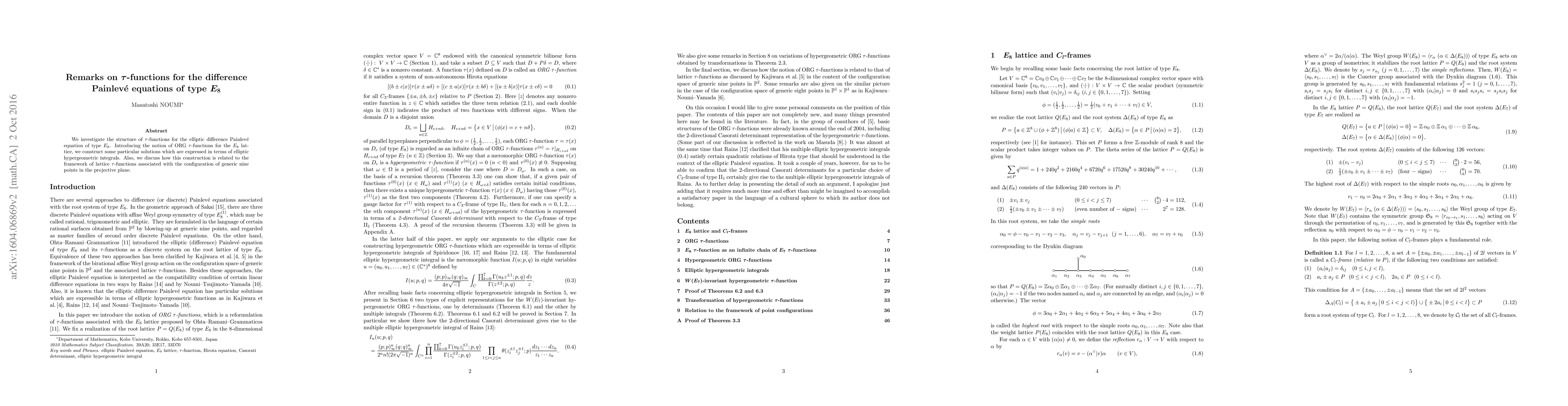 This paper investigates $ au$-functions for the difference Painlev\'e equation of type $E_8$, introducing a new concept called ORG $ au$-functions and constructing solutions using elliptic hypergeometric integrals.