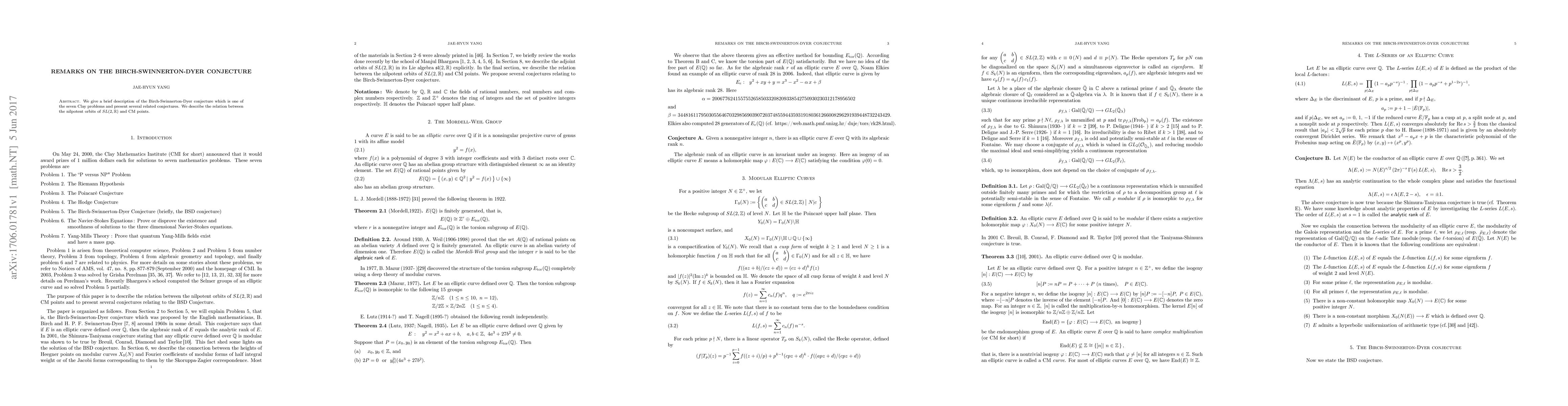 Summary: This paper provides an overview of the Birch-Swinnerton-Dyer conjecture and associated conjectures, highlighting the connection between nilpotent orbits in SL(2,R) and complex multiplication (CM) points.