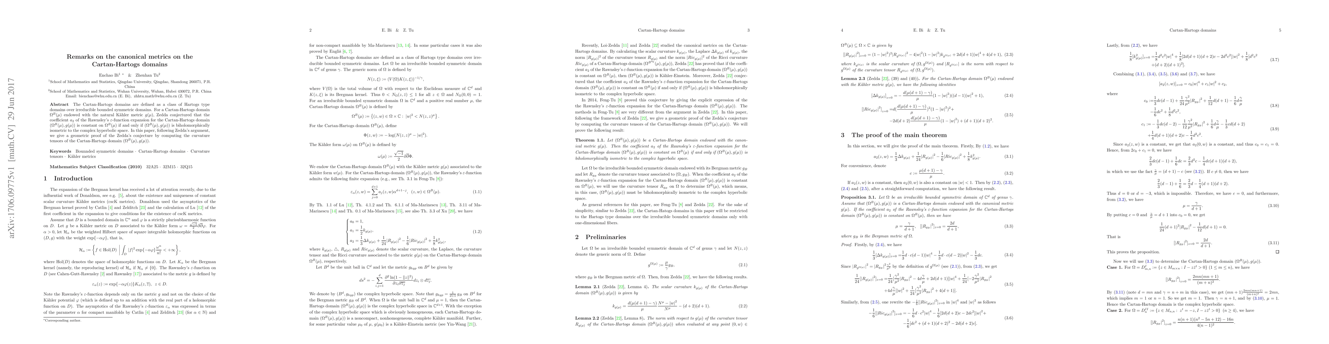 The Cartan-Hartogs domains are defined as a class of Hartogs type domains over irreducible bounded symmetric domains. For a Cartan-Hartogs domain $\Omega^{B}(\mu)$ endowed with the natural K\"{a}hler metric $g(\mu),$ Zedda conjectured that the coefficient $a_2$ of the Rawnsley's $\varepsilon$-function expansion for the Cartan-Hartogs domain $(\Omega^{B}(\mu), g(\mu))$ is constant on $\Omega^{B}(\mu)$ if and only if $(\Omega^{B}(\mu), g(\mu))$ is biholomorphically isometric to the complex hyperbolic space. In this paper, following Zedda's argument, we give a geometric proof of the Zedda's conjecture by computing the curvature tensors of the Cartan-Hartogs domain $(\Omega^{B}(\mu), g(\mu))$.
