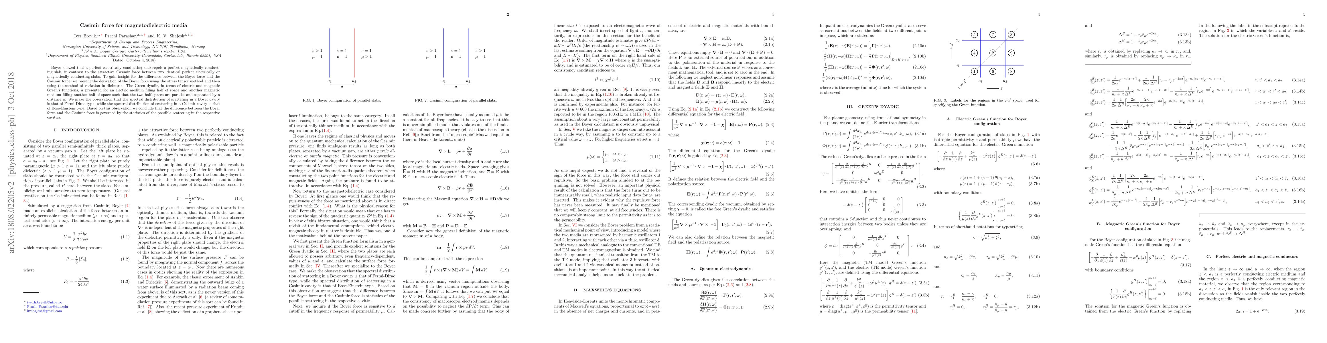 Boyer showed that a perfect electrically conducting slab repels a perfect magnetically conducting slab, in contrast to the attractive Casimir force between two identical perfect electrically/magnetically conducting slabs. To gain insight for the difference between the Boyer force and the Casimir force, we present the derivation of the Boyer force using the stress tensor method and then using the method of variation in dielectric. The Green dyadic, in terms of electric and magnetic Green's functions, is presented for an electric medium filling half of space and another magnetic medium filling another half of space such that the two half-spaces are parallel and separated by a distance $a$. We make the observation that the spectral distribution of scattering in a Boyer cavity is that of Fermi-Dirac type, while the spectral distribution of scattering in a Casimir cavity is that of Bose-Einstein type. Based on this observation we conclude that the difference between the Boyer force and the Casimir force is governed by the statistics of the possible scattering in the respective cavities.