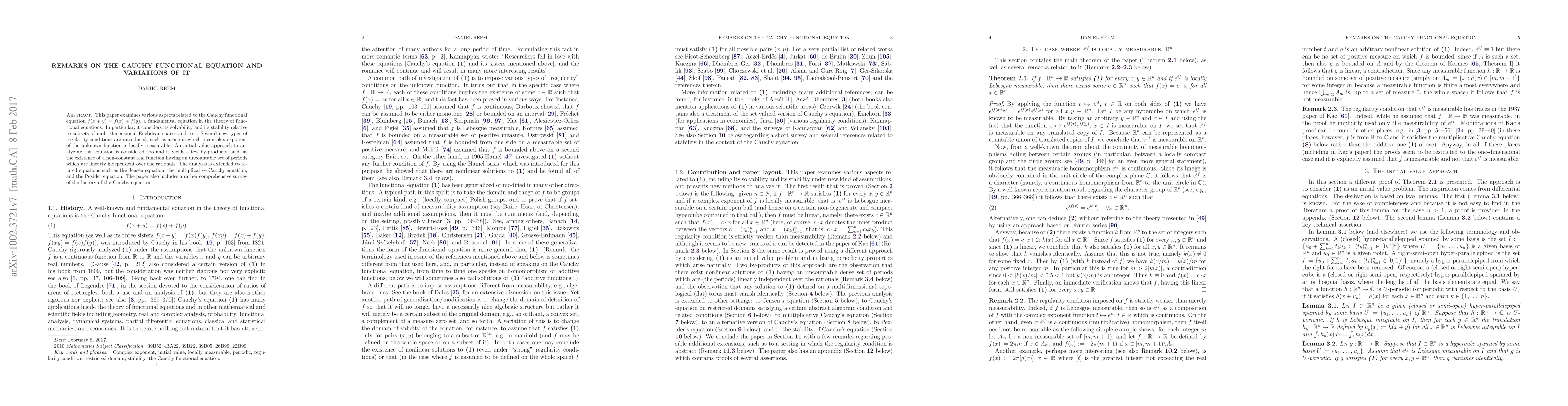 The paper examines the Cauchy functional equation and its variations using advanced mathematical techniques, including regularity conditions, initial value approaches, and analyzing related equations like Jensen, multiplicative Cauchy, and Pexider equations.