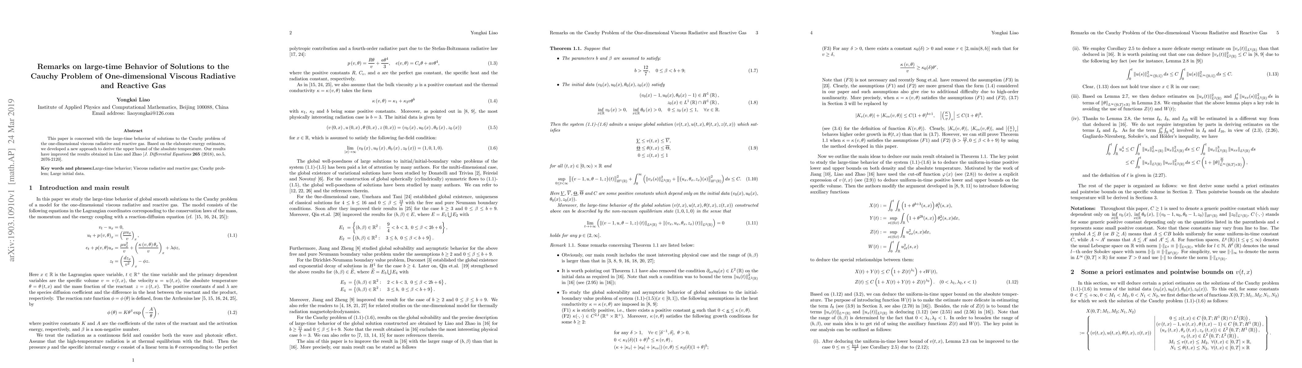 This paper investigates the long-term behavior of solutions to the Cauchy problem for one-dimensional viscous radiative and reactive gas. The authors introduce a novel method using detailed energy estimates to establish an upper bound for the absolute temperature, surpassing previous results by Liao and Zhao.
