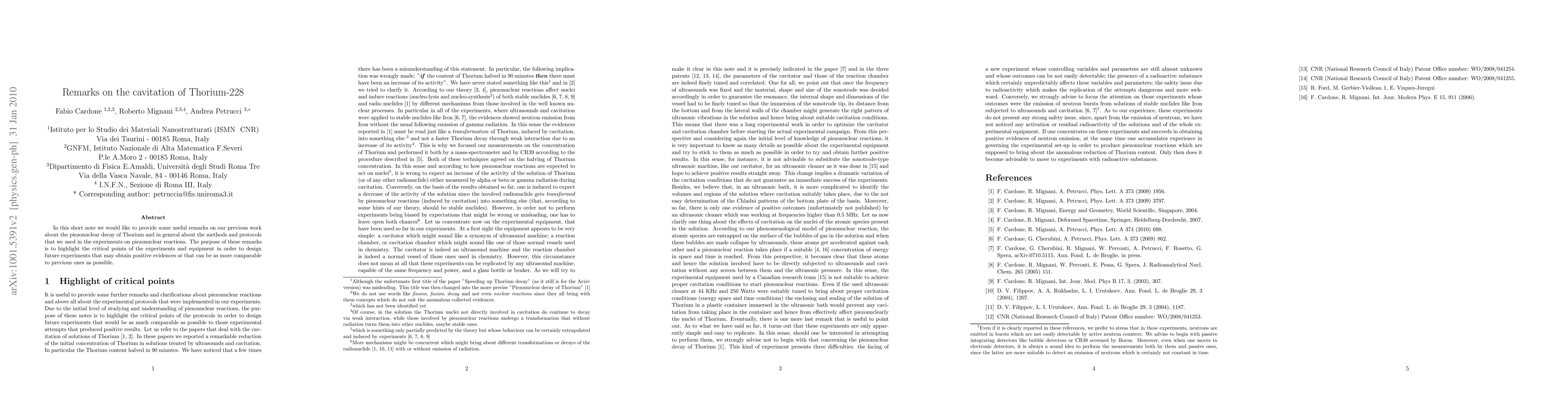 In this short note we would like to provide some useful remarks on our previous work about the piezonuclear decay of Thorium and in general about the methods and protocols that we used in the experiments on piezonuclear reactions. The purpose of these remarks is to highlight the critical points of the experiments and equipment in order to design future experiments that may obtain positive evidences or that can be as more comparable to previous ones as possible.