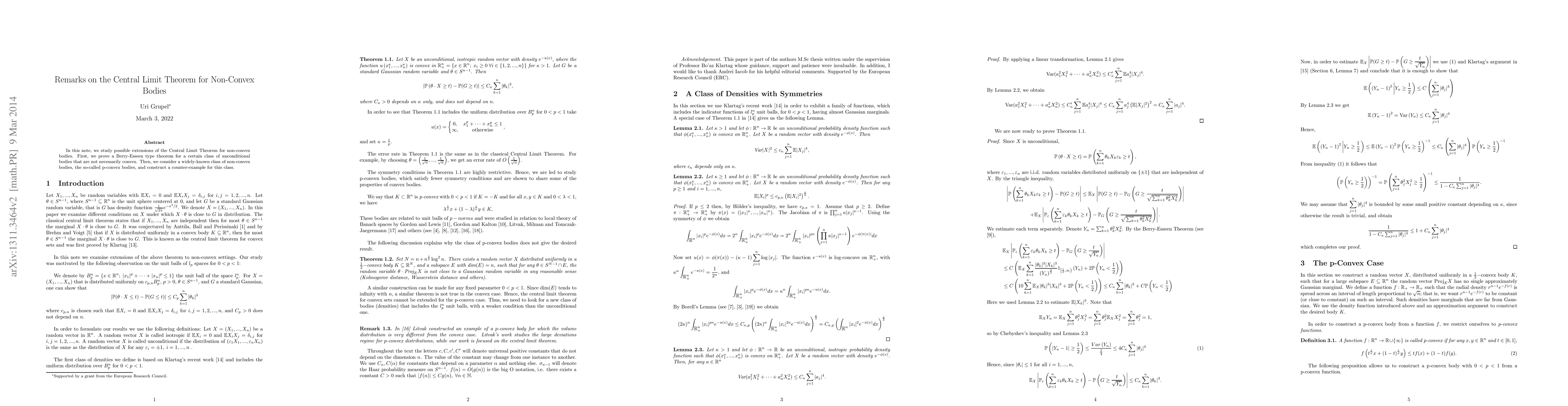 In this note, we study possible extensions of the Central Limit Theorem for non-convex bodies. First, we prove a Berry-Esseen type theorem for a certain class of unconditional bodies that are not necessarily convex. Then, we consider a widely-known class of non-convex bodies, the so-called p-convex bodies, and construct a counter-example for this class.