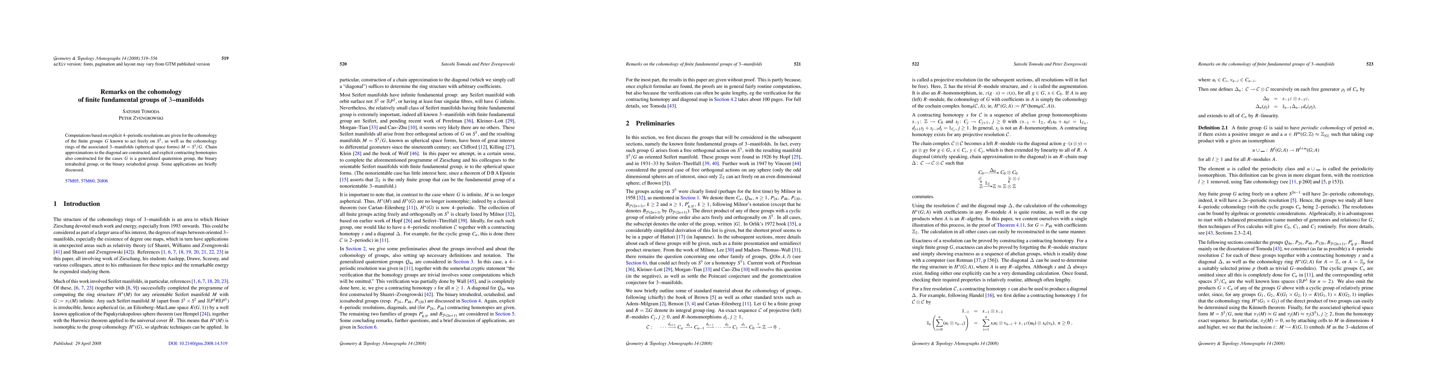 This research paper presents computations of cohomology for finite groups acting freely on 3-sphere (S^3), using 4-periodic resolutions. It also provides cohomology rings for associated 3-manifolds (spherical space forms). The methodology includes constructing chain approximations to the diagonal and contracting homotopies for specific groups like generalized quaternion, binary tetrahedral, and binary octahedral groups. The findings have applications in understanding the topological structure of these manifolds.