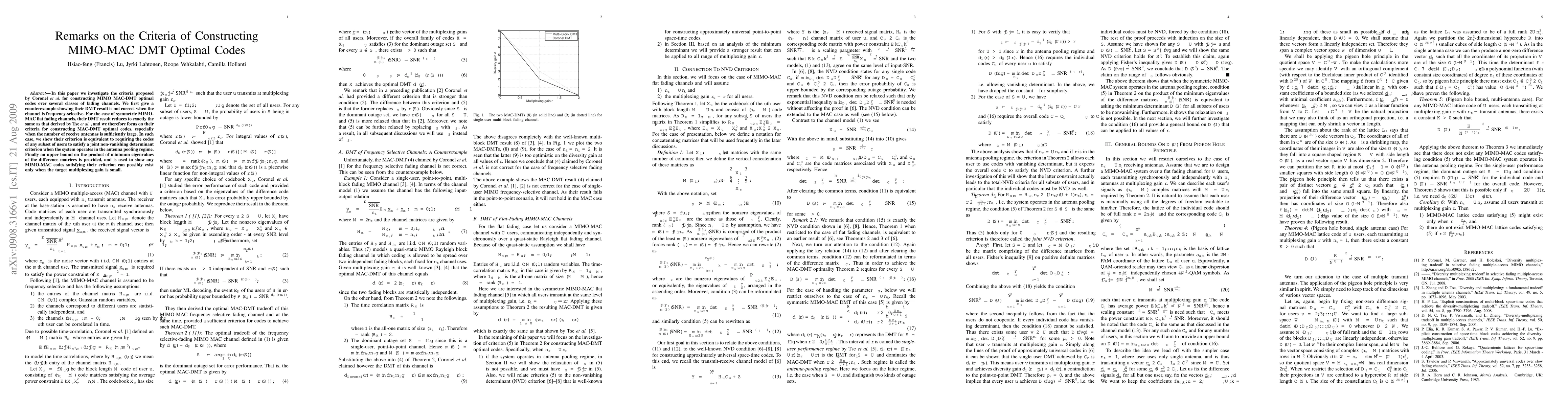 This paper critiques the criteria by Coronel et al. for constructing MIMO MAC-DMT optimal codes, showing their DMT result is incorrect for frequency-selective channels. It confirms their criteria's equivalence to a joint non-vanishing determinant condition for large receive antennas, and provides an upper bound suggesting such codes can only exist at low multiplexing gains.