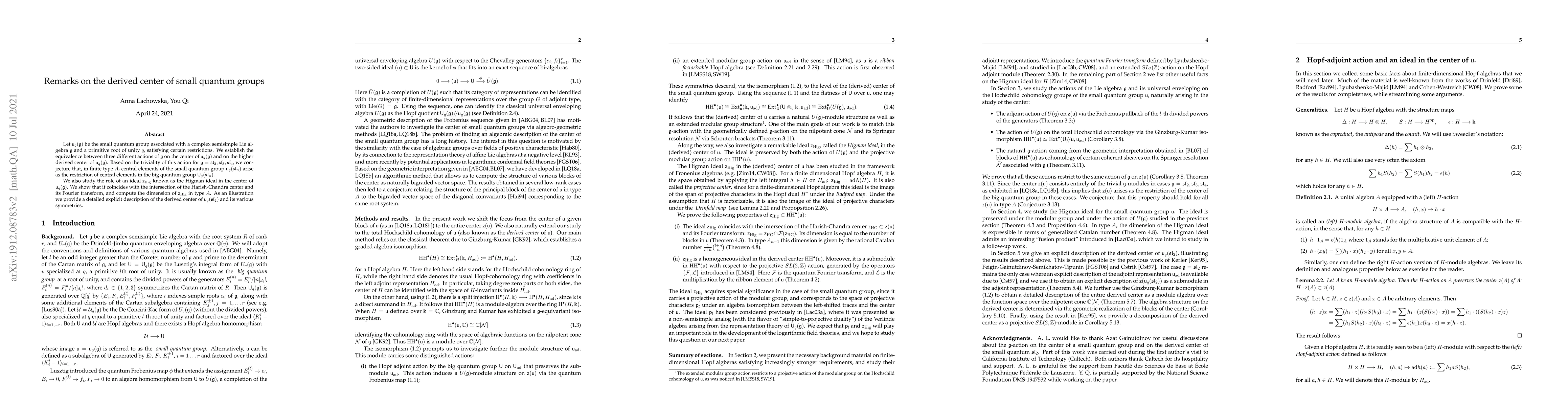 This paper establishes an equivalence between three actions of a complex semisimple Lie algebra on the center and higher derived center of small quantum groups. It conjectures that central elements in small quantum groups arise from big quantum groups in finite type A, and studies the Higman ideal in the center, showing its equivalence with the intersection of the Harish-Chandra center and its Fourier transform, with a detailed analysis of $\mathsf{u}_q(\mathfrak{sl}_2)$.