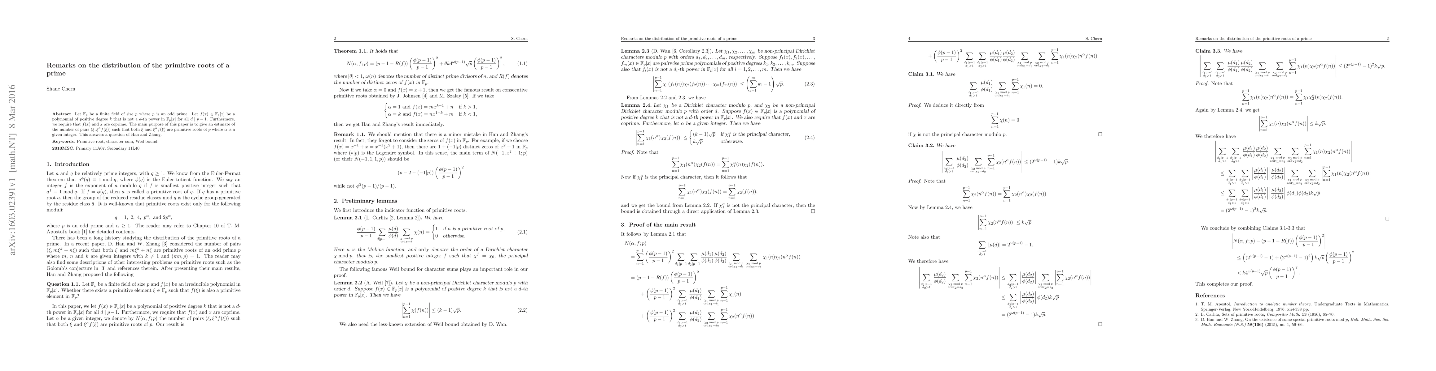 Let $\mathbb{F}_p$ be a finite field of size $p$ where $p$ is an odd prime. Let $f(x)\in\mathbb{F}_p[x]$ be a polynomial of positive degree $k$ that is not a $d$-th power in $\mathbb{F}_p[x]$ for all $d\mid p-1$. Furthermore, we require that $f(x)$ and $x$ are coprime. The main purpose of this paper is to give an estimate of the number of pairs $(\xi,\xi^\alpha f(\xi))$ such that both $\xi$ and $\xi^\alpha f(\xi)$ are primitive roots of $p$ where $\alpha$ is a given integer. This answers a question of Han and Zhang.