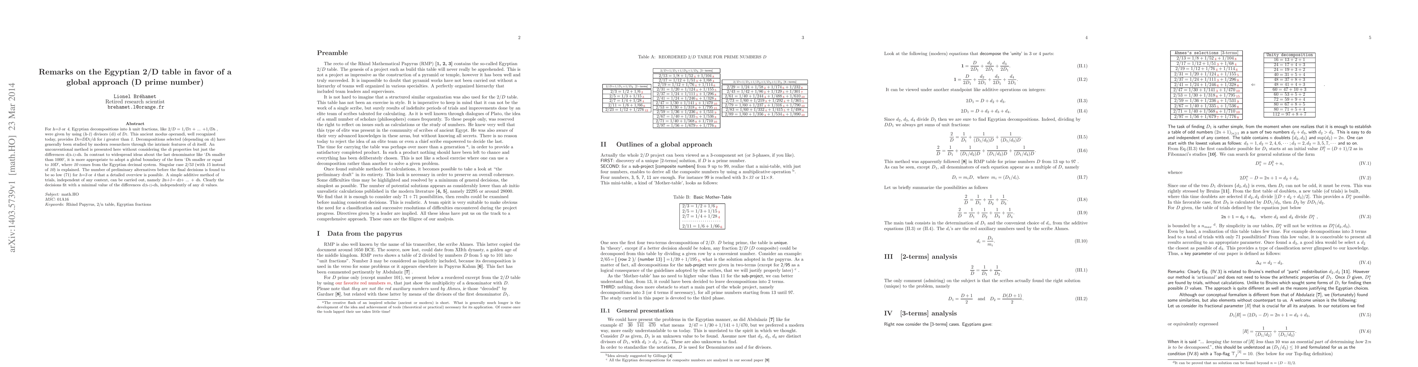 For h=3 or 4, Egyptian decompositions into h unit fractions, like 2/D = 1/D1 + ... +1/Dh, were given by using (h-1) divisors (di) of D1. This ancient modus operandi, well recognized today, provides Di=DD1/di for i greater than 1. Decompositions selected (depending on di) have generally been studied by modern researchers through the intrinsic features of di itself. An unconventional method is presented here without considering the di properties but just the differences d(h-1)-dh. In contrast to widespread ideas about the last denominator like 'Dh smaller than 1000', it is more appropriate to adopt a global boundary of the form 'Dh smaller or equal to 10D', where 10 comes from the Egyptian decimal system. Singular case 2/53 (with 15 instead of 10) is explained. The number of preliminary alternatives before the final decisions is found tobe so low (71) for h=3 or 4 that a detailed overview is possible. A simple additive method of trials, independent of any context, can be carried out, namely 2n+1= d2+ ... + dh. Clearly the decisions fit with a minimal value of the differences d(h-1)-dh, independently of any di values.