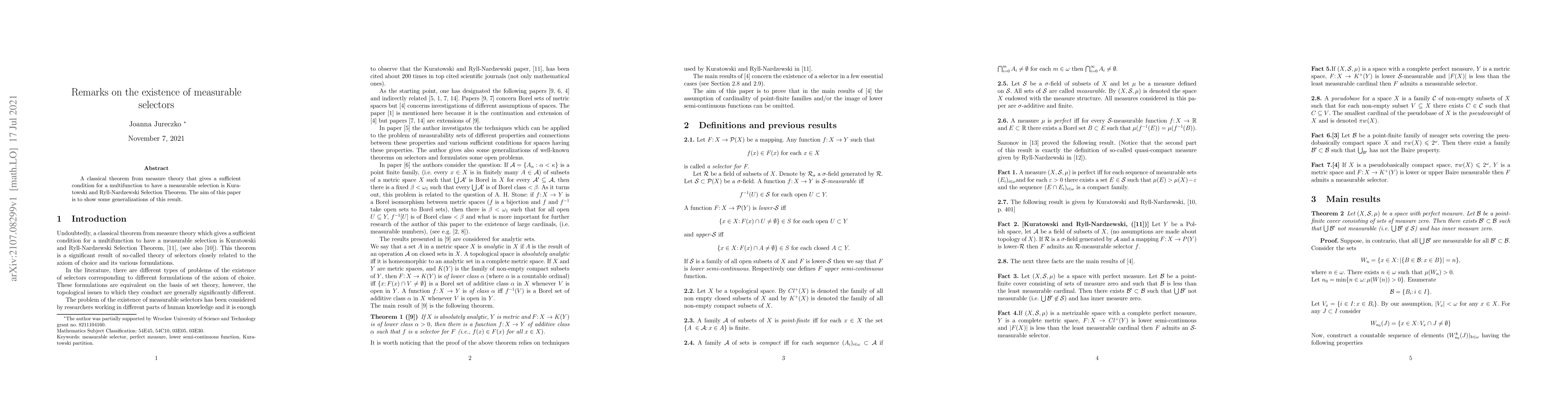 A classical theorem from measure theory that gives a sufficient condition for a multifunction to have a measurable selection is Kuratowski and Ryll-Nardzewski Selection Theorem. The aim of this paper is to show some generalizations of this result.
