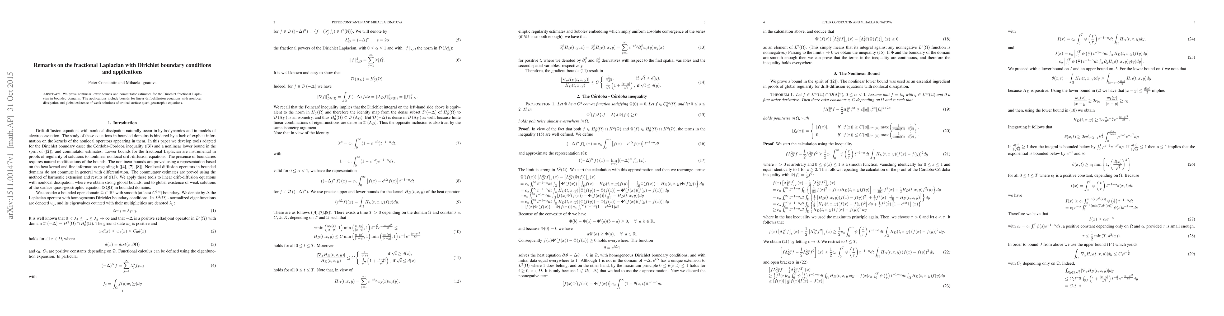 This paper establishes nonlinear lower bounds and commutator estimates for the Dirichlet fractional Laplacian in bounded domains, with applications to linear drift-diffusion equations and the global existence of weak solutions for critical surface quasi-geostrophic equations.