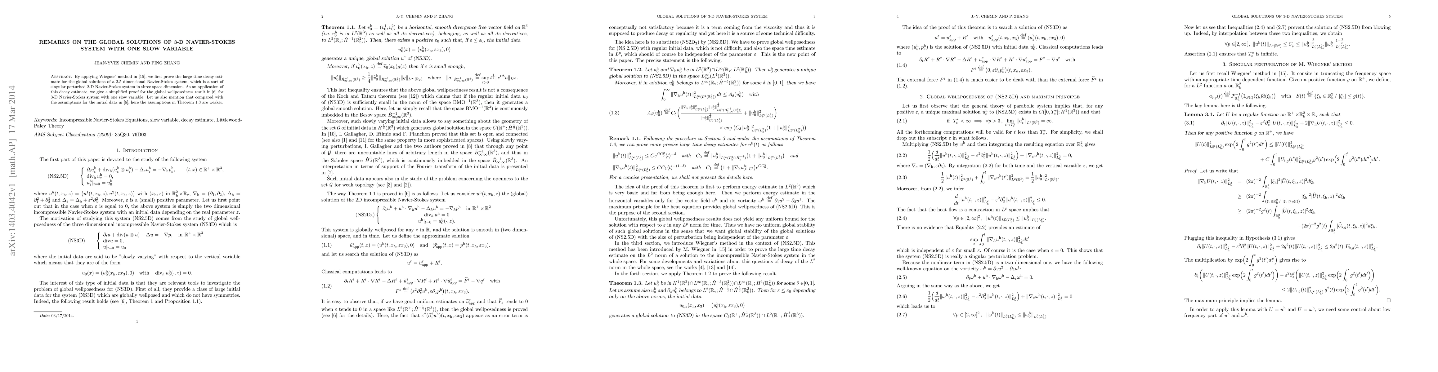 This paper applies Wiegner's method to establish large time decay estimates for global solutions of a 2.5D Navier-Stokes system, simplifying the proof of global wellposedness for a 3-D Navier-Stokes system with one slow variable. The assumptions on initial data in this work are weaker than those in previous studies.