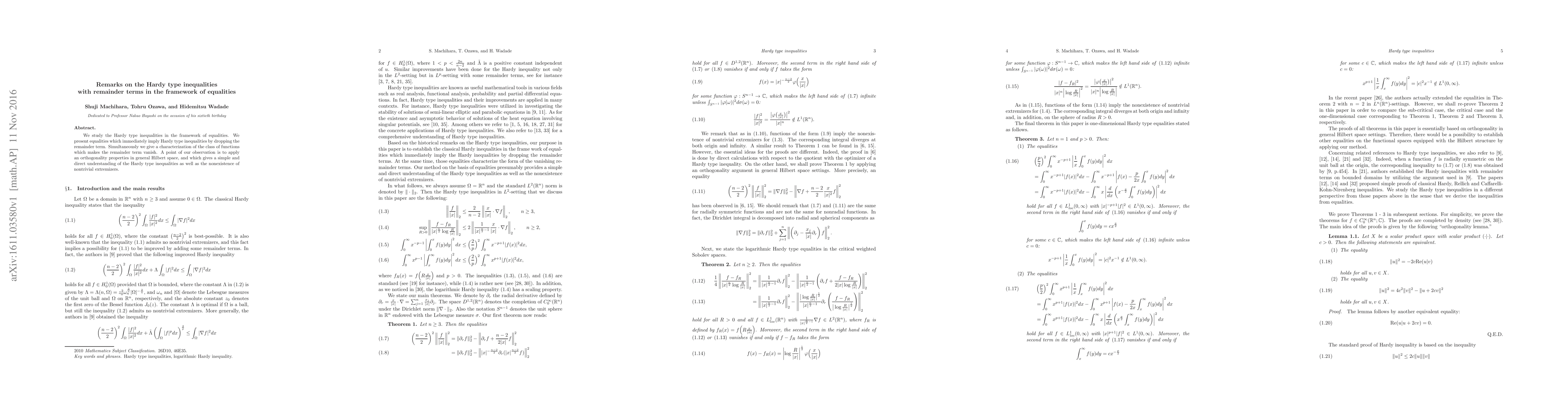 This paper investigates Hardy type inequalities framed within the context of equalities, presenting equalities that inherently imply these inequalities by omitting the remainder term. It also characterizes the class of functions that nullify the remainder term, utilizing orthogonality properties in Hilbert spaces to provide a straightforward understanding of the inequalities and the nonexistence of nontrivial extremizers.