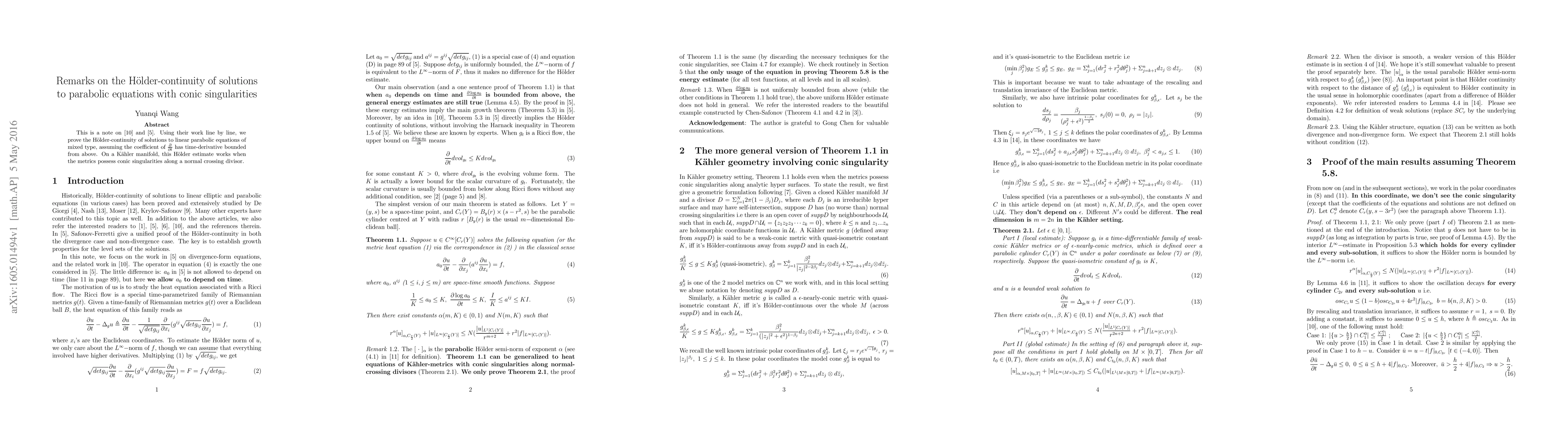 Summary: This paper builds on prior works to demonstrate the H\"older-continuity of solutions for linear parabolic equations of mixed type, particularly under time-derivative bounded conditions, and extends this result to K\"ahler manifolds with metrics that have conic singularities along a normal crossing divisor.