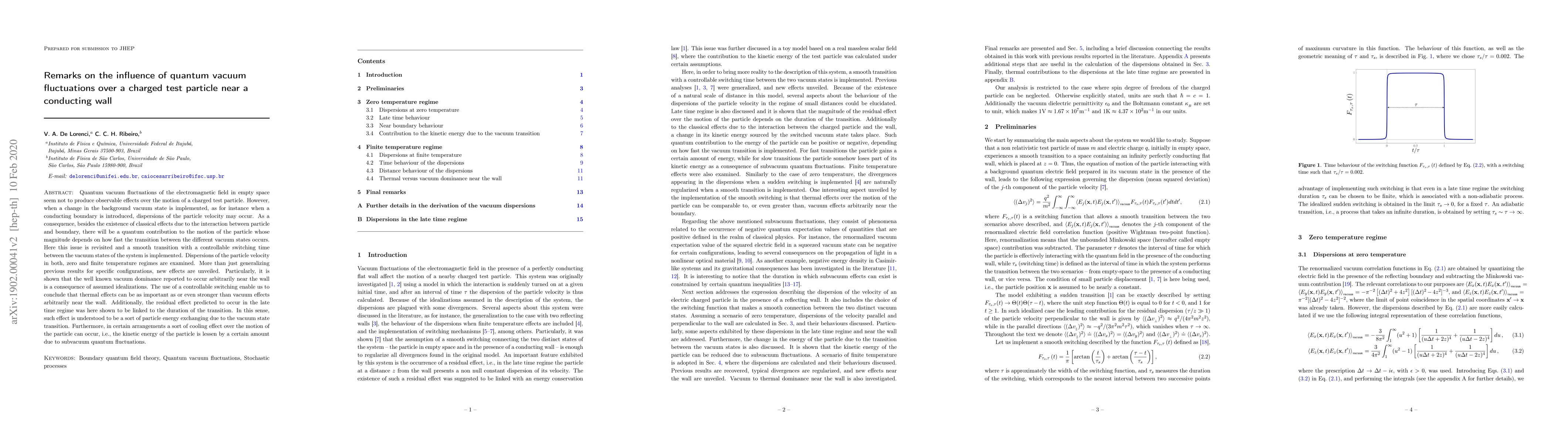 This paper explores how quantum vacuum fluctuations influence a charged test particle near a conducting wall, revealing that such fluctuations can cause dispersions in the particle's velocity. It demonstrates that controllable transitions between vacuum states can lead to a quantum contribution to the particle's motion, with thermal effects potentially rivaling or even surpassing vacuum effects.