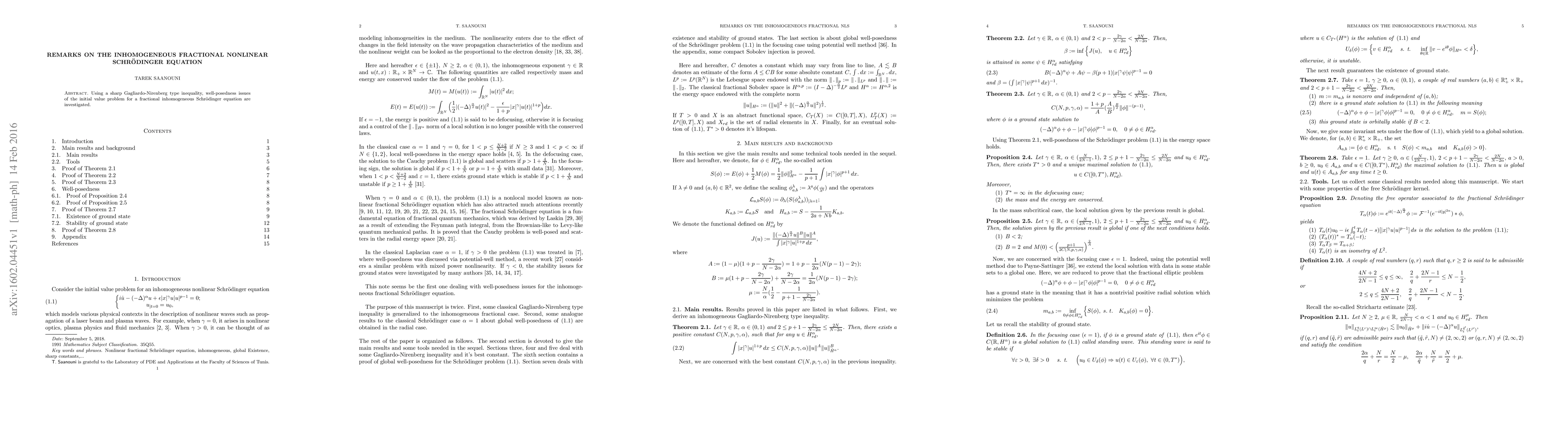 Using a sharp Gagliardo-Nirenberg type inequality, well-posedness issues of the initial value problem for a fractional inhomogeneous Schrodinger equation are investigated.