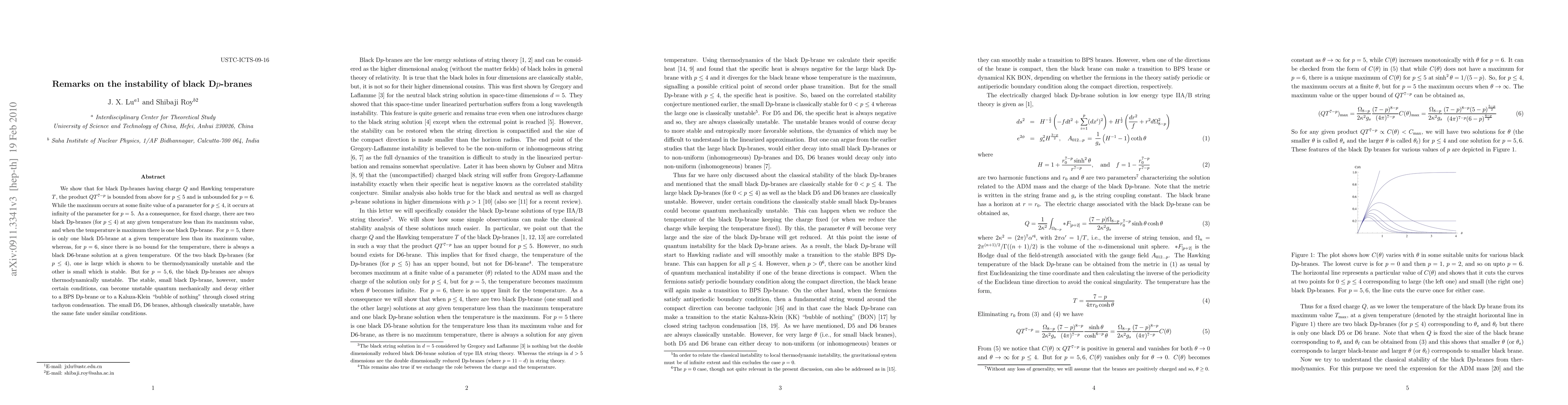 We show that for black D$p$-branes having charge $Q$ and Hawking temperature $T$, the product $QT^{7-p}$ is bounded from above for $p\leq 5$ and is unbounded for $p=6$. While the maximum occurs at some finite value of a parameter for $p \leq 4$, it occurs at infinity of the parameter for $p=5$. As a consequence, for fixed charge, there are two black D$p$-branes (for $p\leq 4$) at any given temperature less than its maximum value, and when the temperature is maximum there is one black D$p$-brane. For $p=5$, there is only one black D5-brane at a given temperature less than its maximum value, whereas, for $p=6$, since there is no bound for the temperature, there is always a black D6-brane solution at a given temperature. Of the two black D$p$-branes (for $p\leq 4$), one is large which is shown to be thermodynamically unstable and the other is small which is stable. But for $p=5,6$, the black D$p$-branes are always thermodynamically unstable. The stable, small black D$p$-brane, however, under certain conditions, can become unstable quantum mechanically and decay either to a BPS D$p$-brane or to a Kaluza-Klein "bubble of nothing" through closed string tachyon condensation. The small D5, D6 branes, although classically unstable, have the same fate under similar conditions.