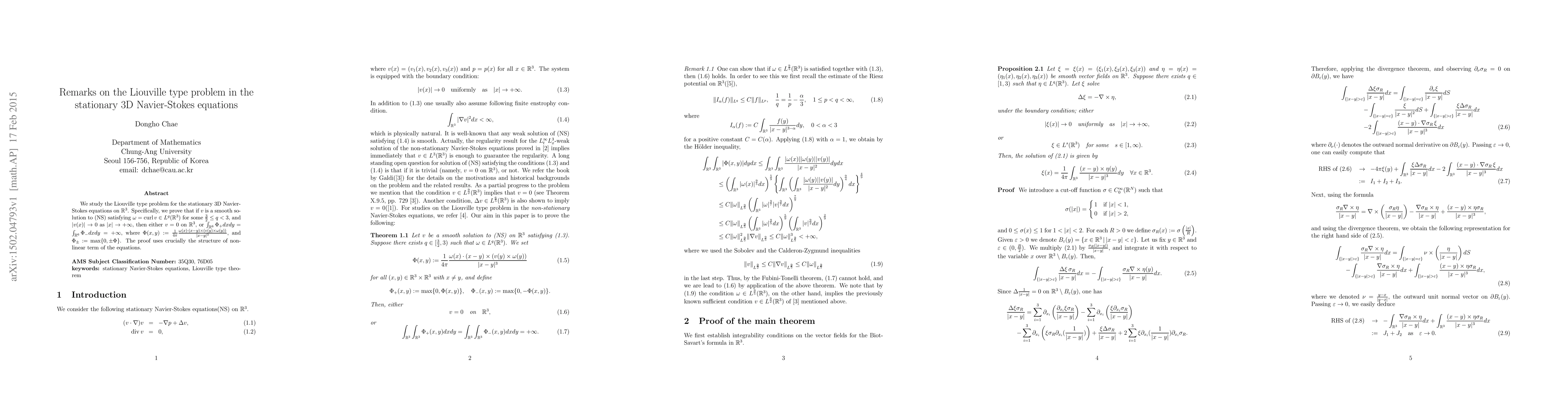 We study the Liouville type problem for the stationary 3D Navier-Stokes equations on $\Bbb R^3$. Specifically, we prove that if $v$ is a smooth solution to (NS) satisfying $\omega={\rm curl}\,v \in L^q (\Bbb R^3) $ for some $\frac32 \leq q< 3$, and $|v(x)|\to 0$ as $|x|\to +\infty$, then either $v=0$ on $\Bbb R^3$, or $\int_{\Bbb R^6} \Phi_+ dxdy=\int_{\Bbb R^6} \Phi_- dxdy=+\infty$, where $\Phi(x,y) :=\frac{1}{4\pi}\frac{\omega (x)\cdot(x-y)\times (v(y)\times \omega(y) )}{|x-y|^3} $, and $\Phi_\pm:=\max\{ 0, \pm \Phi\}$. The proof uses crucially the structure of nonlinear term of the equations.
