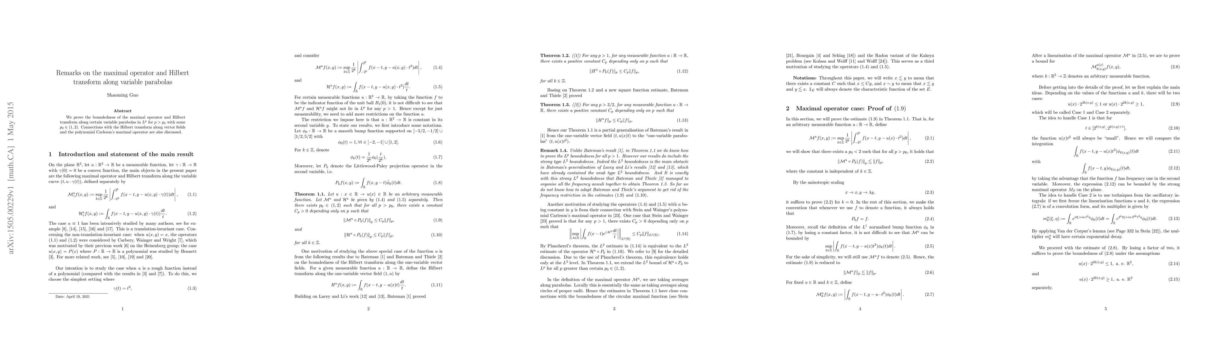 Summary: This paper establishes the boundedness of the maximal operator and Hilbert transform along variable parabolas in $L^p$ for $p>p_0$ where $p_0\in (1, 2)$, and explores connections to the Hilbert transform along vector fields and the polynomial Carleson's maximal operator.