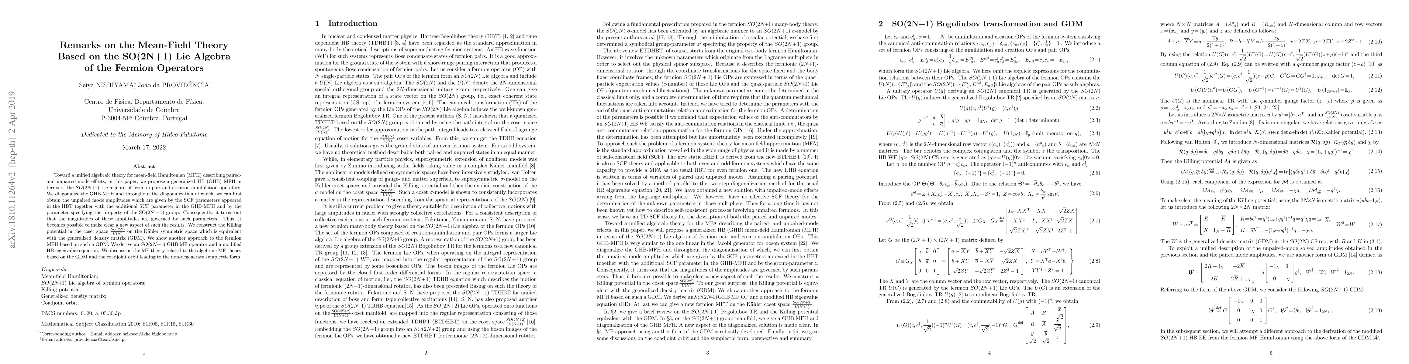 Toward a unified algebraic theory for mean-field Hamiltonian (MFH) describing paired- and unpaired-mode effects, in this paper, we propose a generalized HB (GHB) MFH in terms of the SO(2N+1)Lie algebra of fermion pair and creation-annihilation operators. We diagonalize the GHB-MFH and throughout the diagonalization of which, we can first obtain the unpaired mode amplitudes which are given by the SCF parameters appeared in the HBT together with the additional SCF parameter in the GHB-MFH and by the parameter specifying the property of the SO(2N +1) group. Consequently, it turns out that the magnitudes of these amplitudes are governed by such parameters. Thus, it becomes possible to make clear a new aspect of such the results. We construct the Killing potential in the coset space SO(2N)/U(N) on the Kaehler symmetric space which is equivalent with the generalized density matrix (GDM). We show another approach to the fermion MFH based on such a GDM. We derive an SO(2N +1) GHB MF operator and a modified HB eigenvalue equation. We discuss on the MF theory related to the algebraic MF theory based on the GDM and the coadjoint orbit leading to the non-degenerate symplectic form.