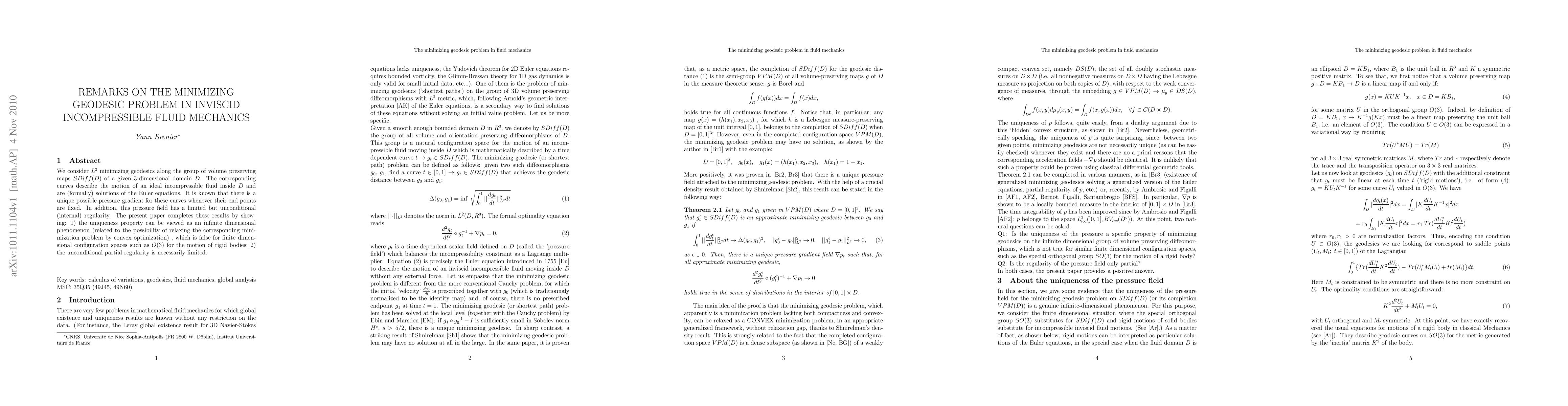 We consider $L^2$ minimizing geodesics along the group of volume preserving maps $SDiff(D)$ of a given 3-dimensional domain $D$. The corresponding curves describe the motion of an ideal incompressible fluid inside $D$ and are (formally) solutions of the Euler equations. It is known that there is a unique possible pressure gradient for these curves whenever their end points are fixed. In addition, this pressure field has a limited but unconditional (internal) regularity. The present paper completes these results by showing: 1) the uniqueness property can be viewed as an infinite dimensional phenomenon (related to the possibility of relaxing the corresponding minimization problem by convex optimization), which is false for finite dimensional configuration spaces such as O(3) for the motion of rigid bodies; 2) the unconditional partial regularity is necessarily limited.
