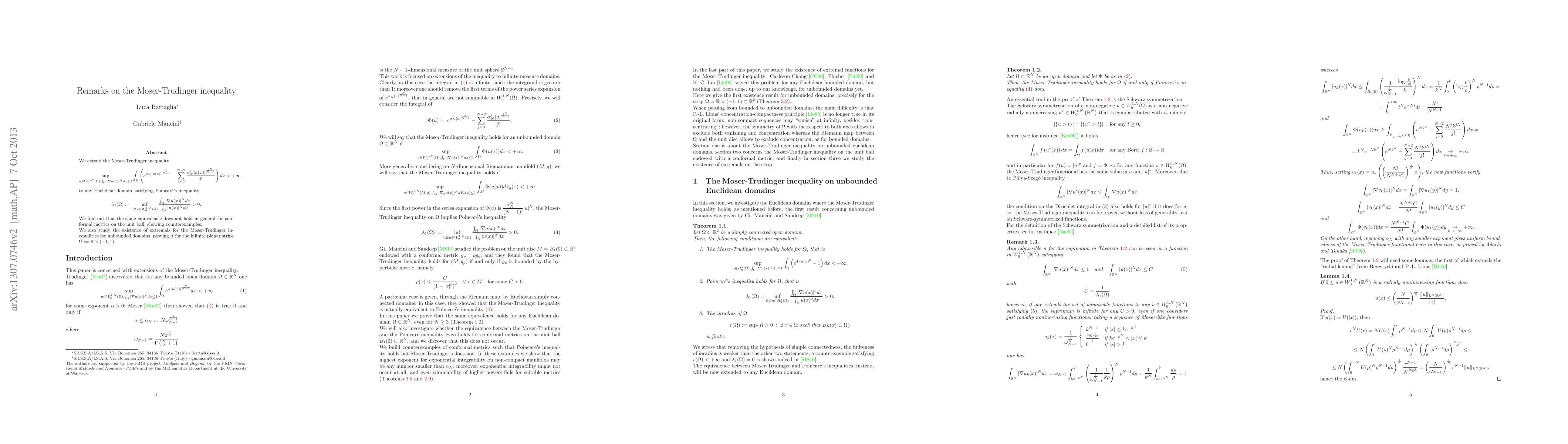 This paper extends the Moser-Trudinger inequality to Euclidean domains with Poincaré's inequality but finds counterexamples for conformal metrics on the unit ball. It also proves the existence of extremals for the inequality in the infinite planar strip.