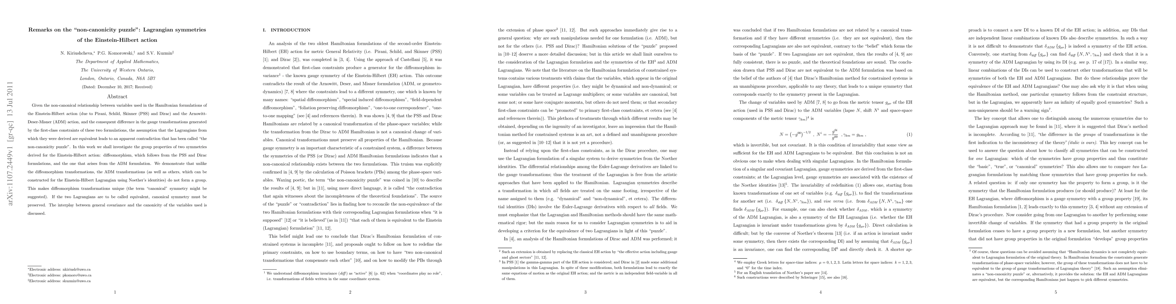 This paper investigates the "non-canonicity puzzle" in the context of the Einstein-Hilbert action, highlighting the differences in gauge transformations between the PSS and ADM formulations. It reveals that while diffeomorphism transformations form a group, ADM transformations do not, suggesting that only the former can be considered a "canonical" symmetry.