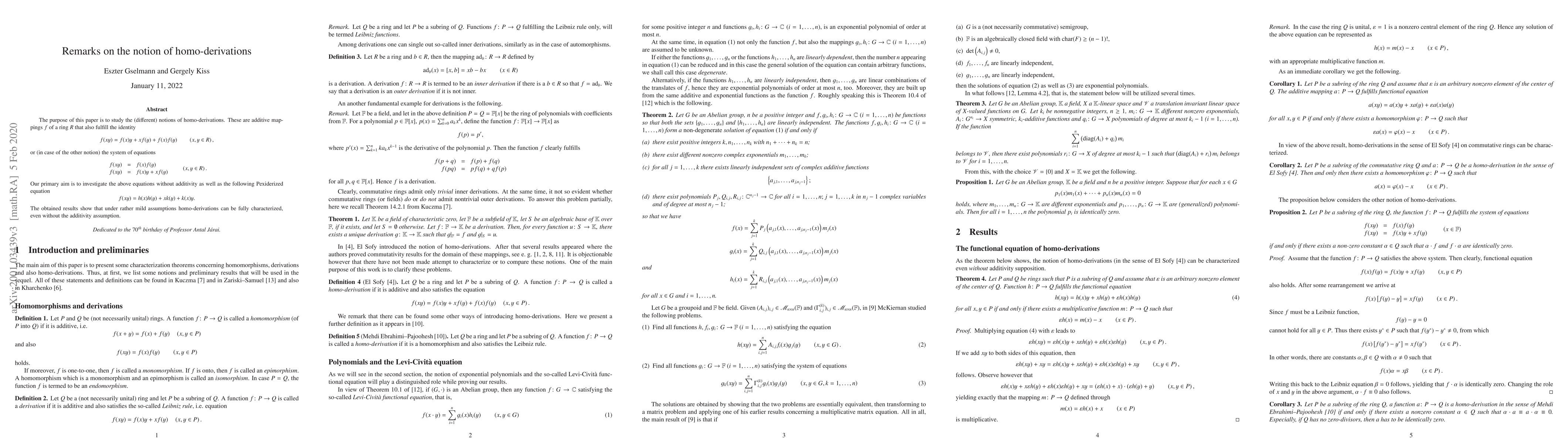 The purpose of this paper is to study the (different) notions of homo-derivations. These are additive mappings $f$ of a ring $R$ that also fulfill the identity \[ f(xy)=f(x)y+xf(y)+f(x)f(y) \qquad \left(x, y\in R\right), \] or (in case of the other notion) the system of equations \[ f(xy)=f(x)f(y)\] \[f(xy)=f(x)y+xf(y) \qquad \left(x, y\in R\right).\] Our primary aim is to investigate the above equations without additivity as well as the following Pexiderized equation \[ f(xy)=h(x)h(y)+xk(y)+k(x)y. \] The obtained results show that under rather mild assumptions homo-derivations can be fully characterized, even without the additivity assumption.